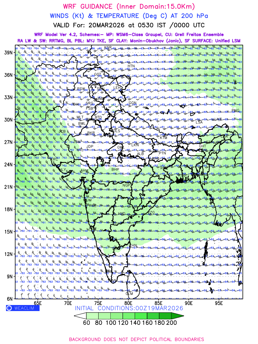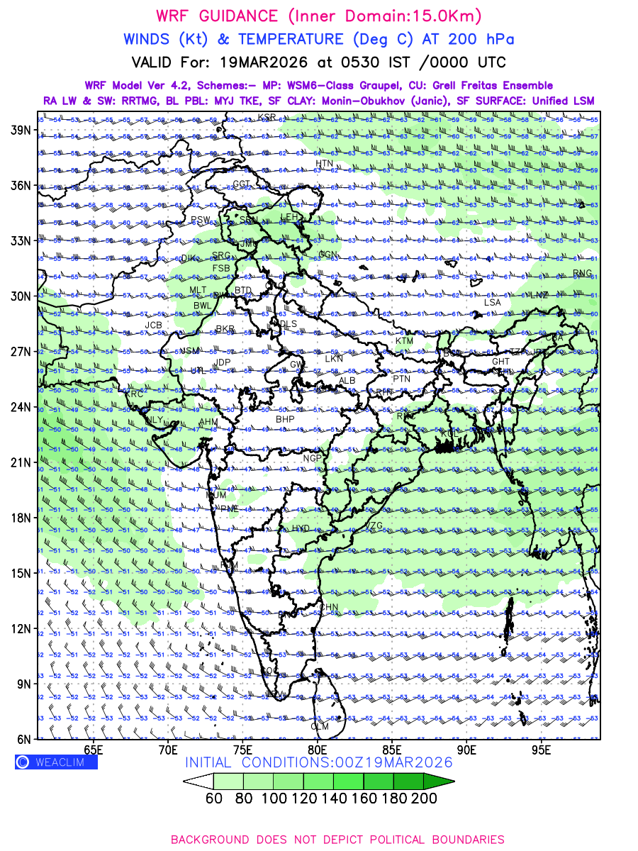 Winds at 200 hPa at the 24 th hour generated using WRF Ver 4.2 at a resolution of 15 Km for India refers to the predicted wind direction and speed at a pressure level of 200 hPa, which is located in the upper troposphere (approximately 12 kilometers or 7.5 miles above the Earth’s surface). The winds are presented knots (kt), and the direction is given in degrees from true north. ‘Jet Streams’ are marked in shades of green for winds with magnitude of more than 60 kt is a narrow band of high-speed winds that can influence weather patterns over large areas. Along with the wind speed (kt) and direction, upper air temperatures (Deg C) are also shown at the grid points over the Indian Region at 200 hPa level for the next four days.