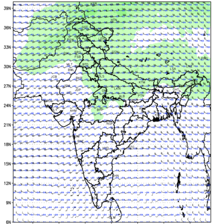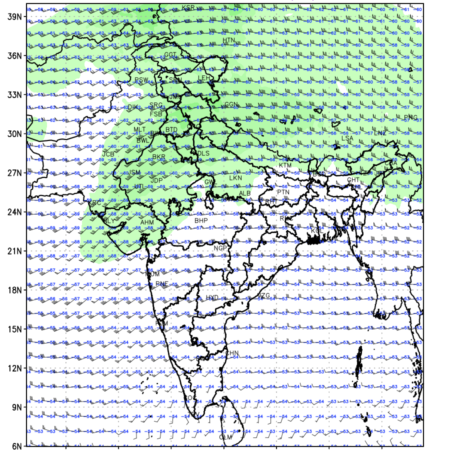 Winds at 200 hPa at the 24 th hour generated using WRF Ver 4.2 at a resolution of 15 Km for India refers to the predicted wind direction and speed at a pressure level of 200 hPa, which is located in the upper troposphere (approximately 12 kilometers or 7.5 miles above the Earth’s surface). The winds are presented knots (kt), and the direction is given in degrees from true north. ‘Jet Streams’ are marked in shades of green for winds with magnitude of more than 60 kt is a narrow band of high-speed winds that can influence weather patterns over large areas. Along with the wind speed (kt) and direction, upper air temperatures (Deg C) are also shown at the grid points over the Indian Region at 200 hPa level for the next four days.