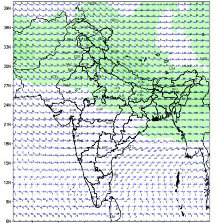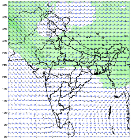 Winds at 200 hPa at the 24 th hour generated using WRF Ver 4.2 at a resolution of 15 Km for India refers to the predicted wind direction and speed at a pressure level of 200 hPa, which is located in the upper troposphere (approximately 12 kilometers or 7.5 miles above the Earth’s surface). The winds are presented knots (kt), and the direction is given in degrees from true north. ‘Jet Streams’ are marked in shades of green for winds with magnitude of more than 60 kt is a narrow band of high-speed winds that can influence weather patterns over large areas. Along with the wind speed (kt) and direction, upper air temperatures (Deg C) are also shown at the grid points over the Indian Region at 200 hPa level for the next four days.