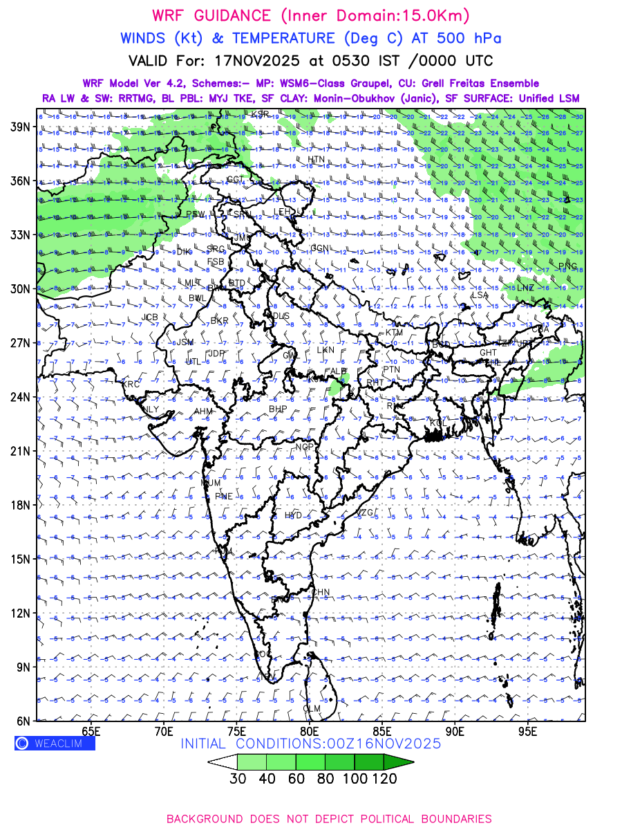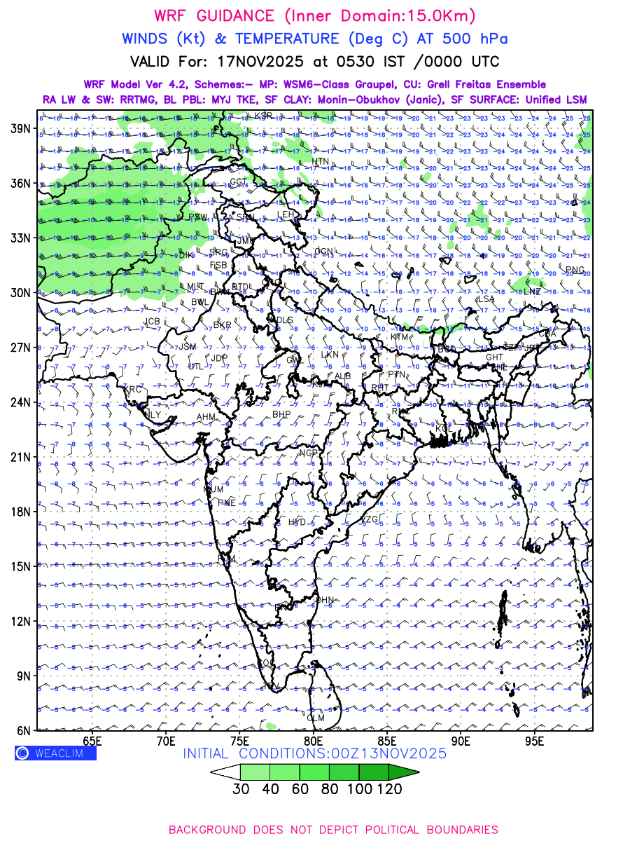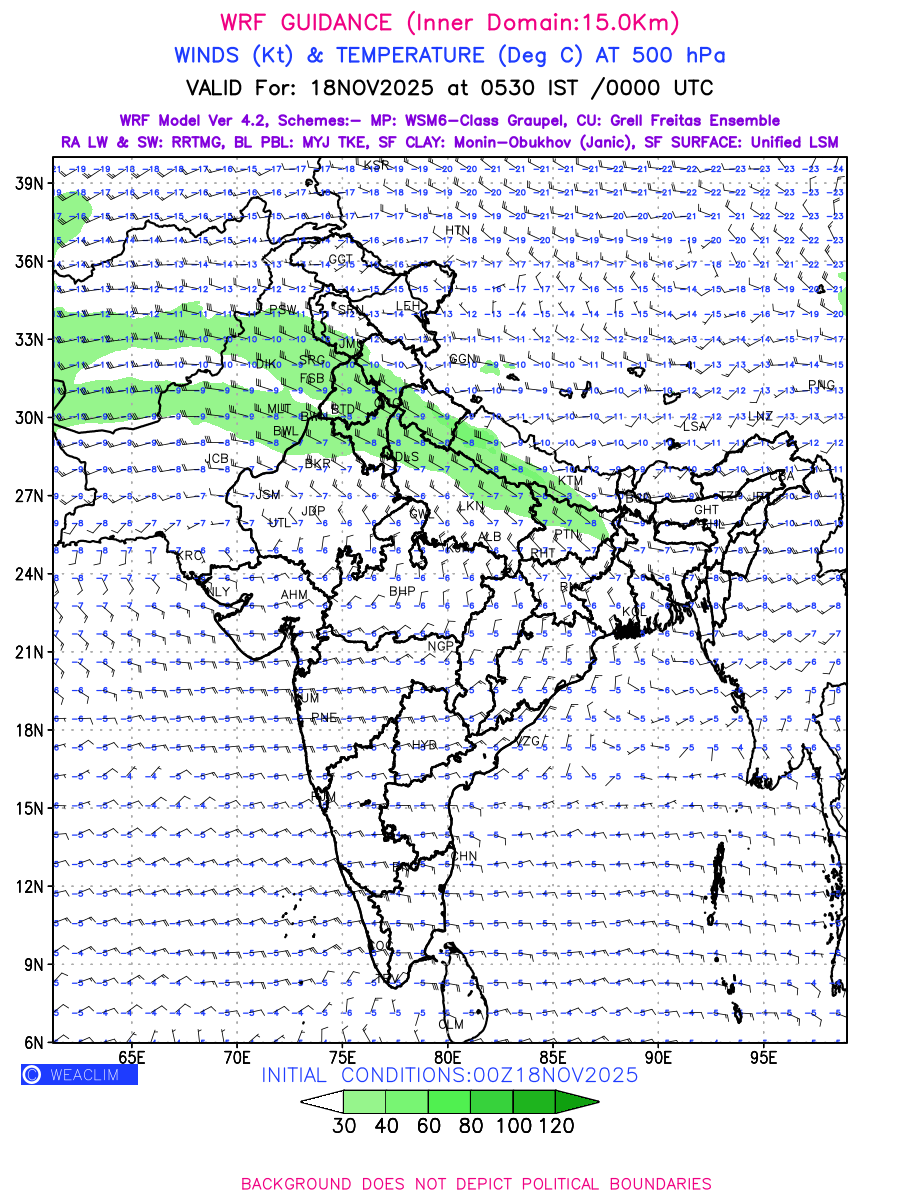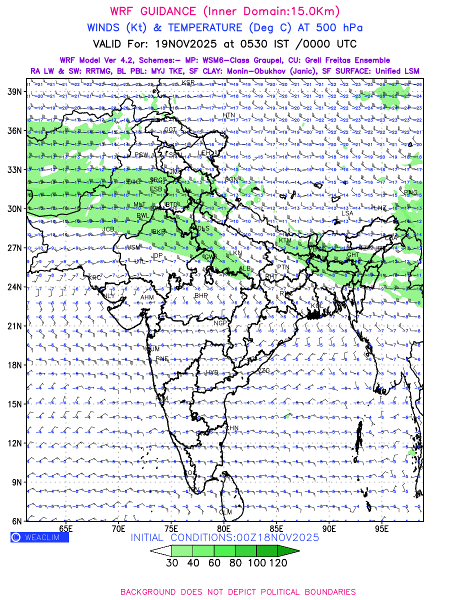 Winds at 500 hPa at the 24th hour generated using WRF Ver 4.2 at a resolution of 15 Km for India refers to the predicted wind direction and speed at a pressure level of 500 hPa, which is located in the upper troposphere about 5.5 km (18,000 ft) above the Earth’s surface. The winds are presented in knots (kt), and the direction is given in degrees from true north. Winds with magnitude of more than 40 kt are marked in shades of green. It provides important information on forecasting weather patterns, including the movement and intensification of storms, the development of weather fronts, and the location and strength of high and low pressure systems. The depiction also shows the temperature along with the wind barb on the grid points at 500 hPa. Along with the wind speed (kt) and direction, upper air temperatures (Deg C) are also shown at the grid points over the Indian Region at 500 hPa level for the next four days.