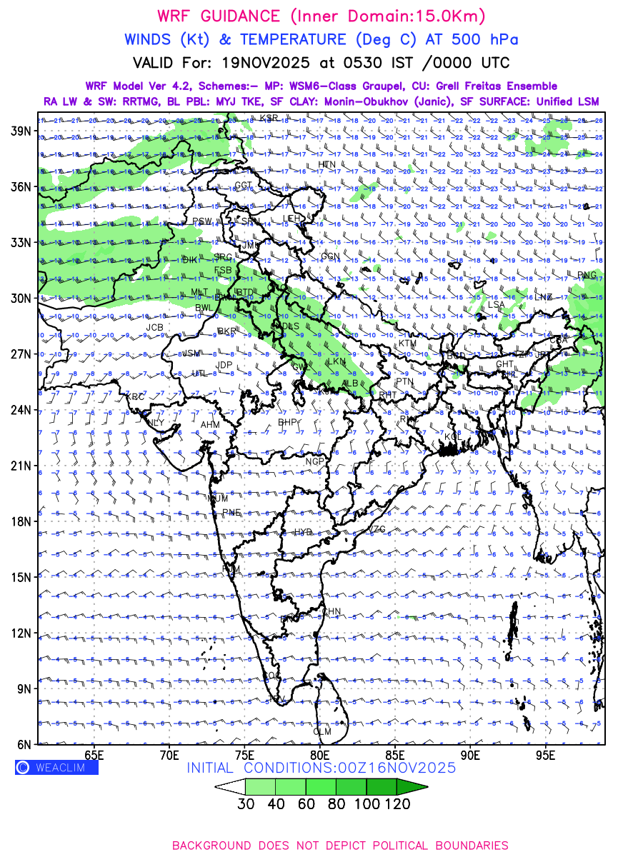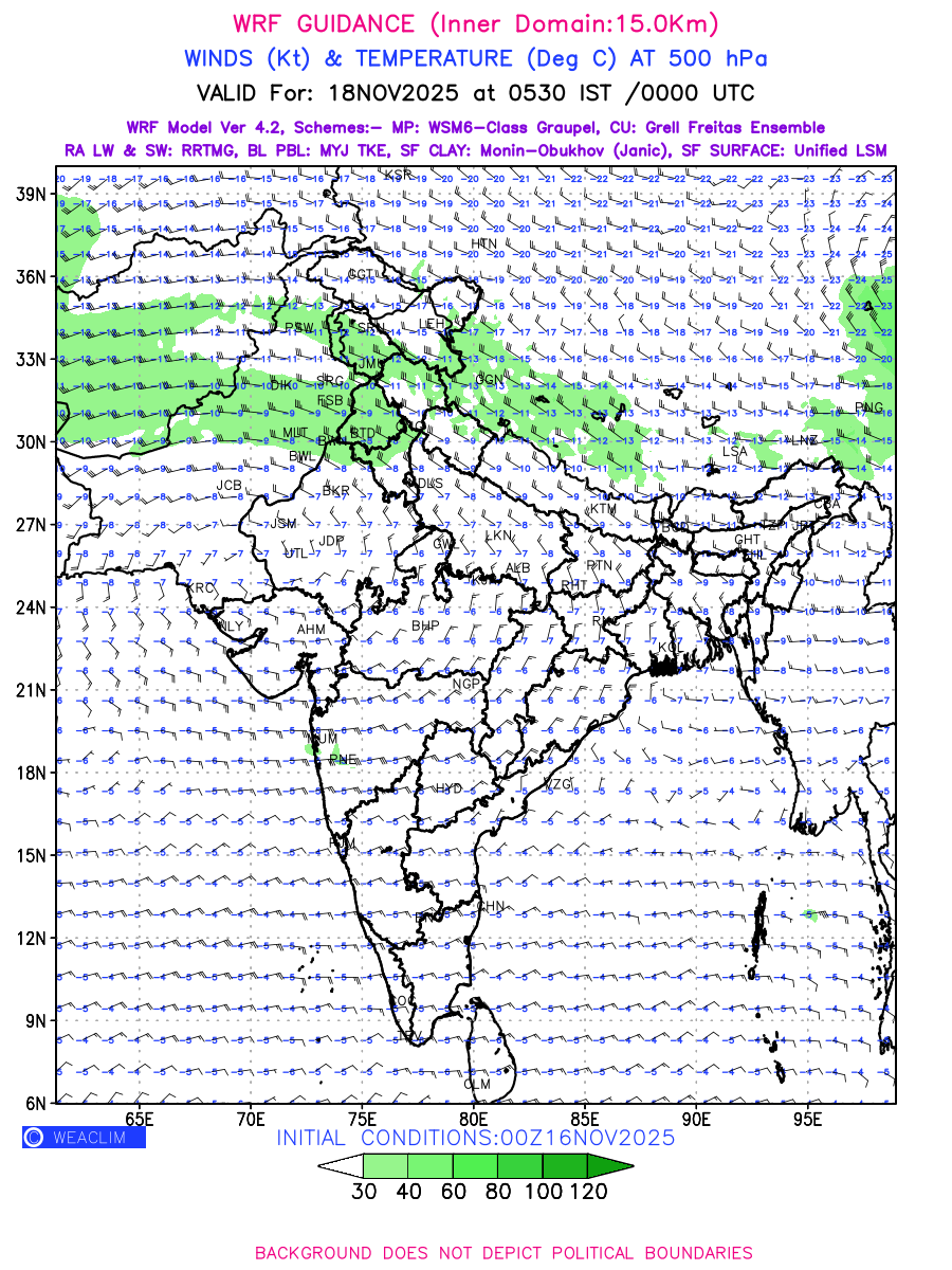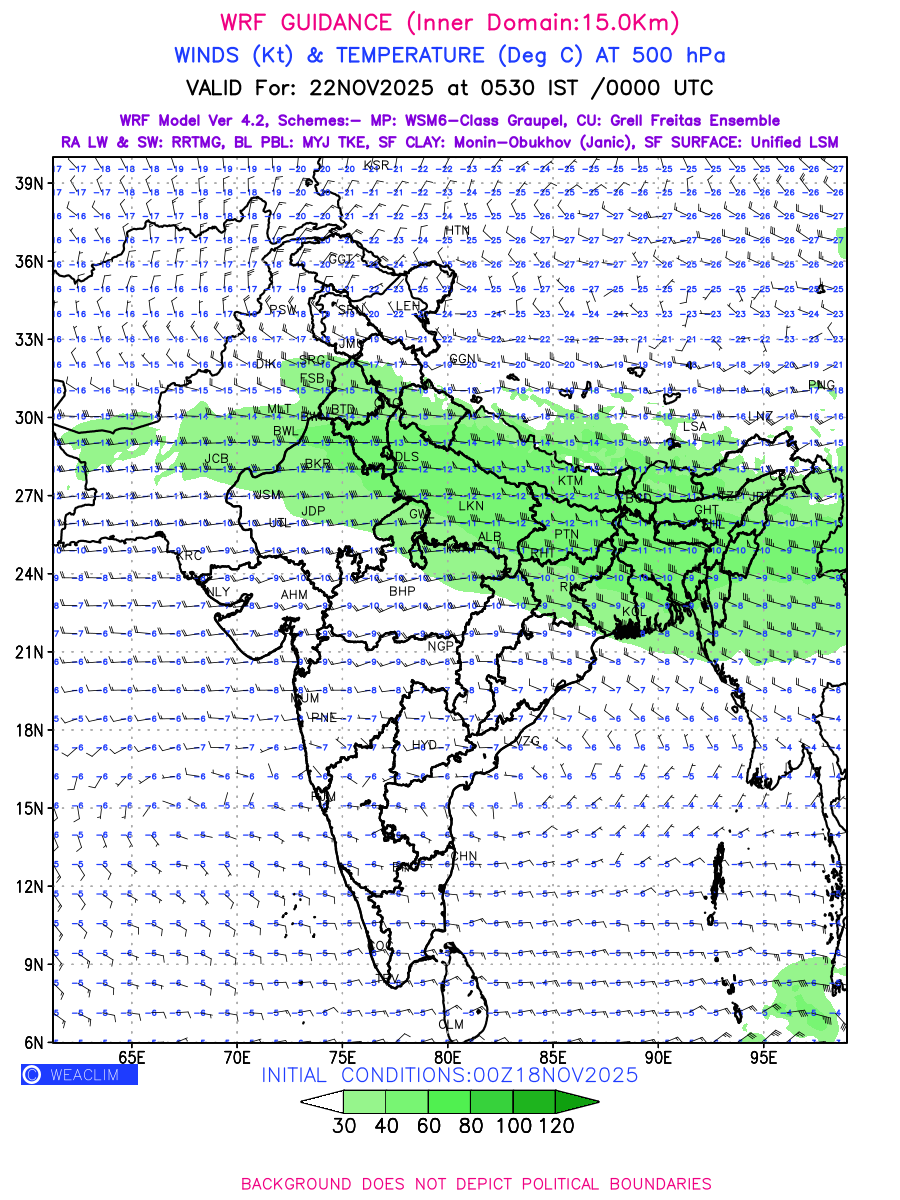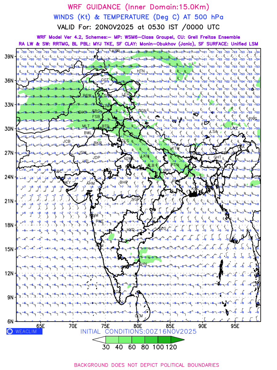 Winds at 500 hPa at the 24th hour generated using WRF Ver 4.2 at a resolution of 15 Km for India refers to the predicted wind direction and speed at a pressure level of 500 hPa, which is located in the upper troposphere about 5.5 km (18,000 ft) above the Earth’s surface. The winds are presented in knots (kt), and the direction is given in degrees from true north. Winds with magnitude of more than 40 kt are marked in shades of green. It provides important information on forecasting weather patterns, including the movement and intensification of storms, the development of weather fronts, and the location and strength of high and low pressure systems. The depiction also shows the temperature along with the wind barb on the grid points at 500 hPa. Along with the wind speed (kt) and direction, upper air temperatures (Deg C) are also shown at the grid points over the Indian Region at 500 hPa level for the next four days.