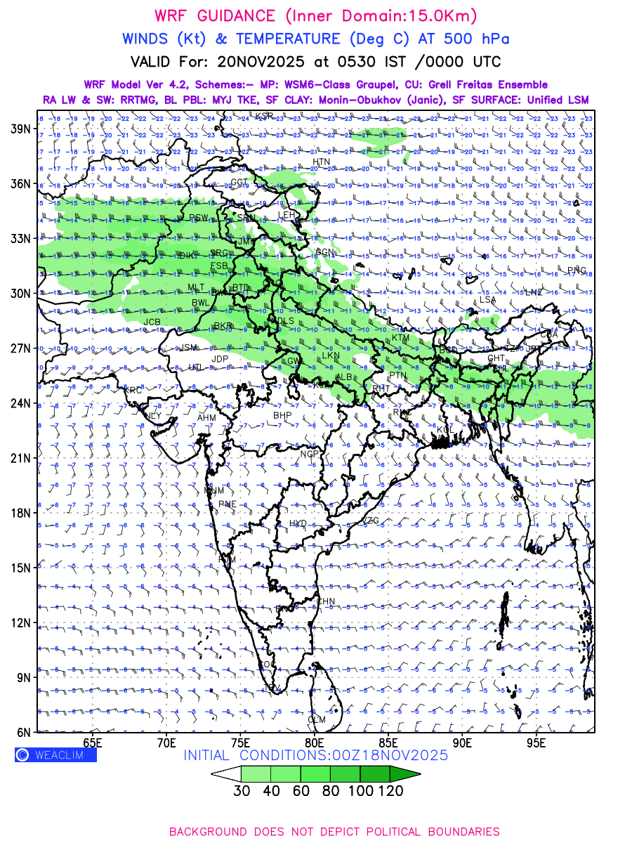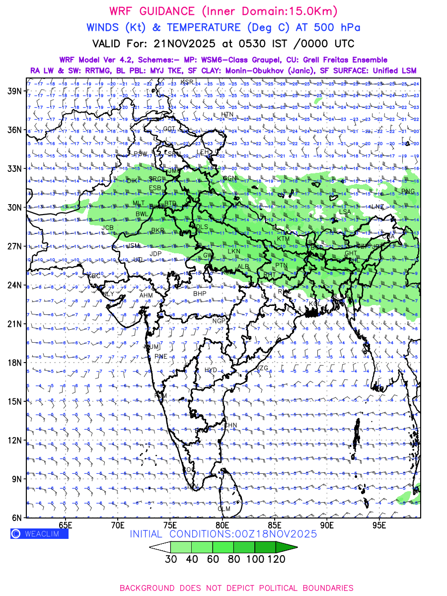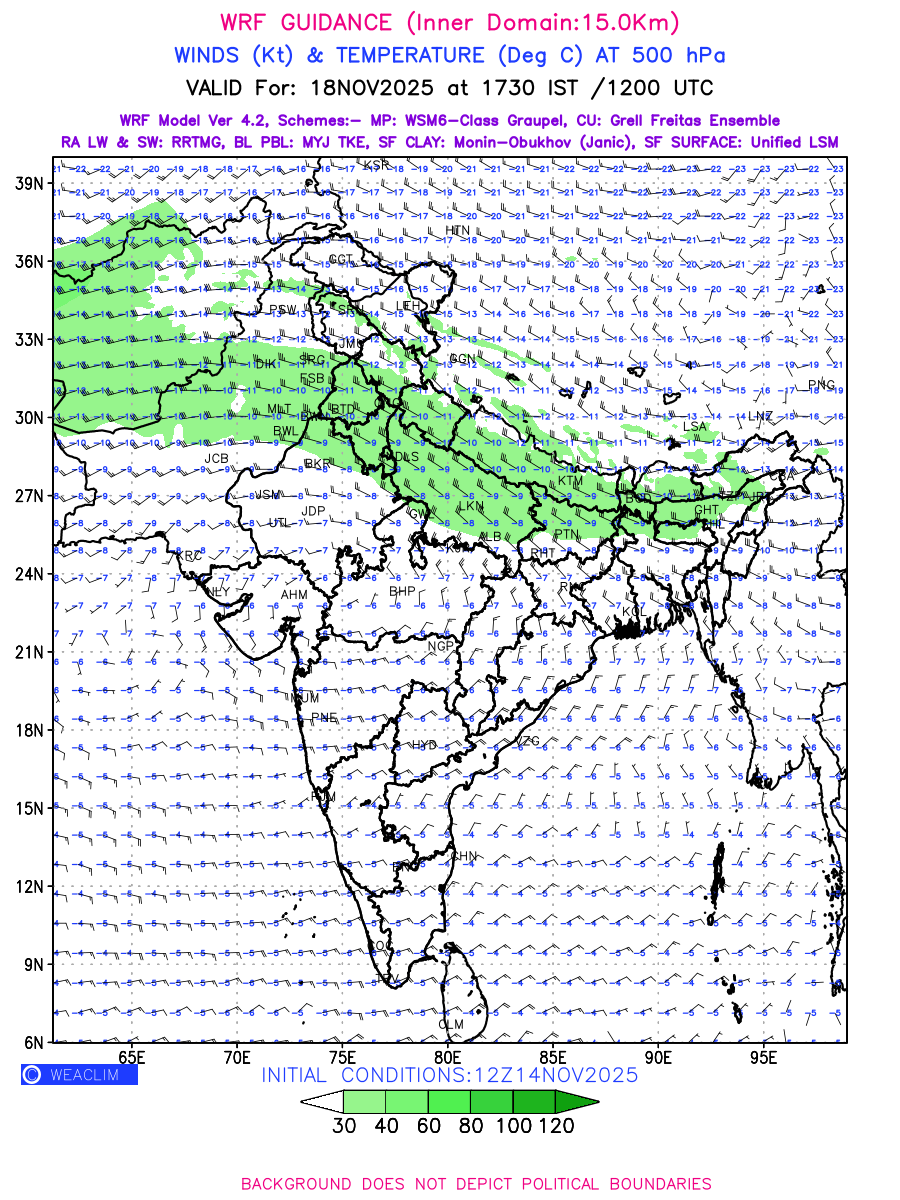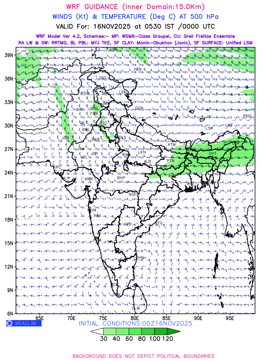 Winds at 500 hPa at the 24th hour generated using WRF Ver 4.2 at a resolution of 15 Km for India refers to the predicted wind direction and speed at a pressure level of 500 hPa, which is located in the upper troposphere about 5.5 km (18,000 ft) above the Earth’s surface. The winds are presented in knots (kt), and the direction is given in degrees from true north. Winds with magnitude of more than 40 kt are marked in shades of green. It provides important information on forecasting weather patterns, including the movement and intensification of storms, the development of weather fronts, and the location and strength of high and low pressure systems. The depiction also shows the temperature along with the wind barb on the grid points at 500 hPa. Along with the wind speed (kt) and direction, upper air temperatures (Deg C) are also shown at the grid points over the Indian Region at 500 hPa level for the next four days.