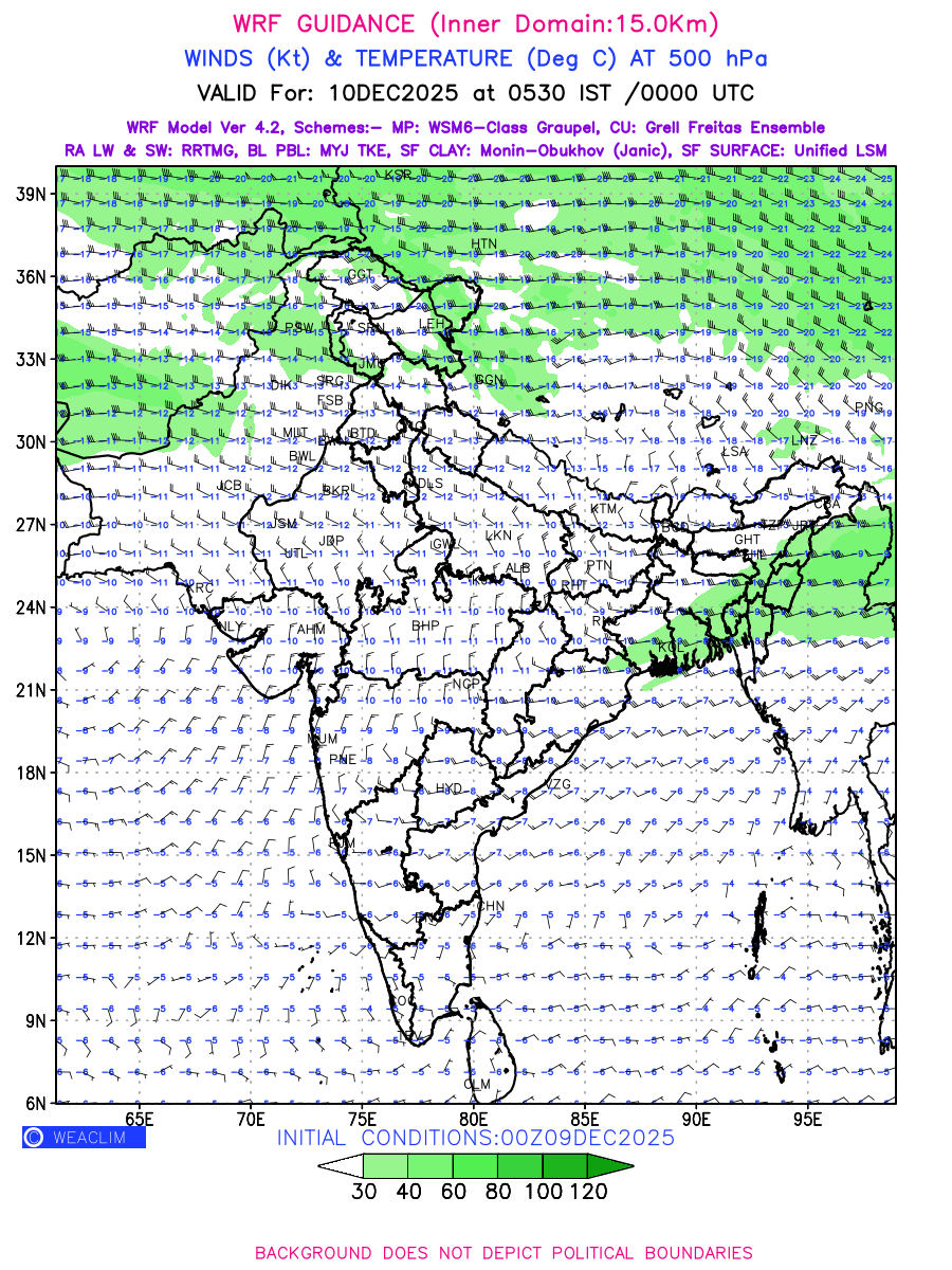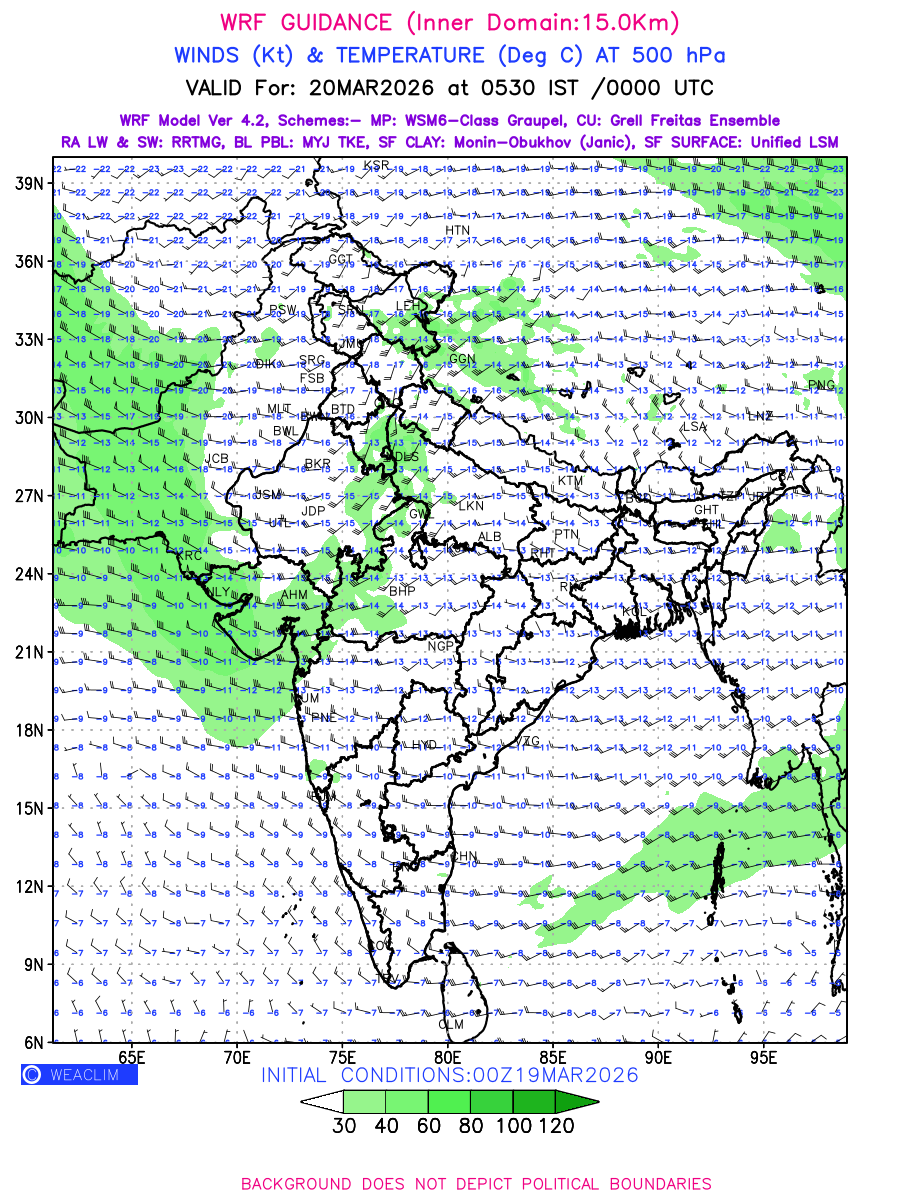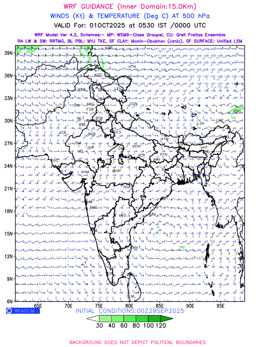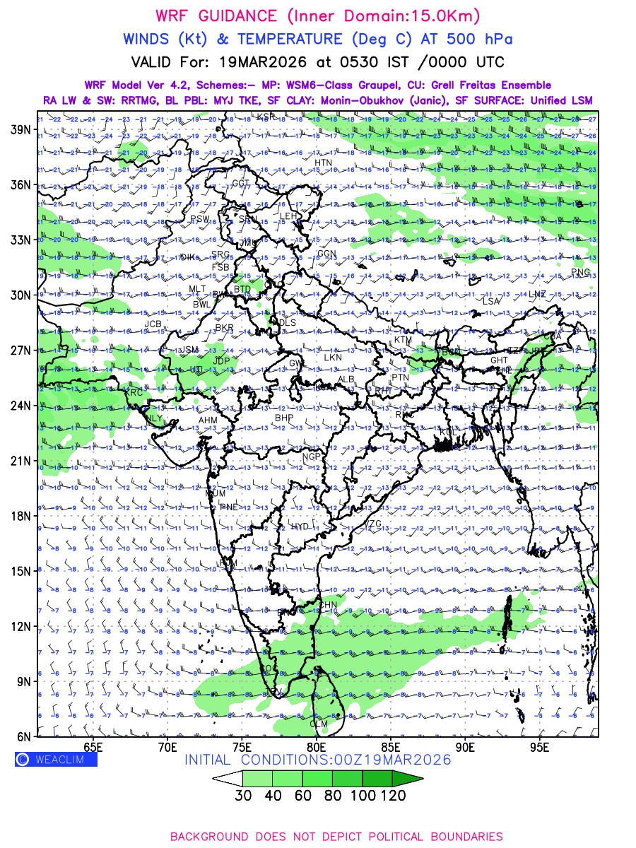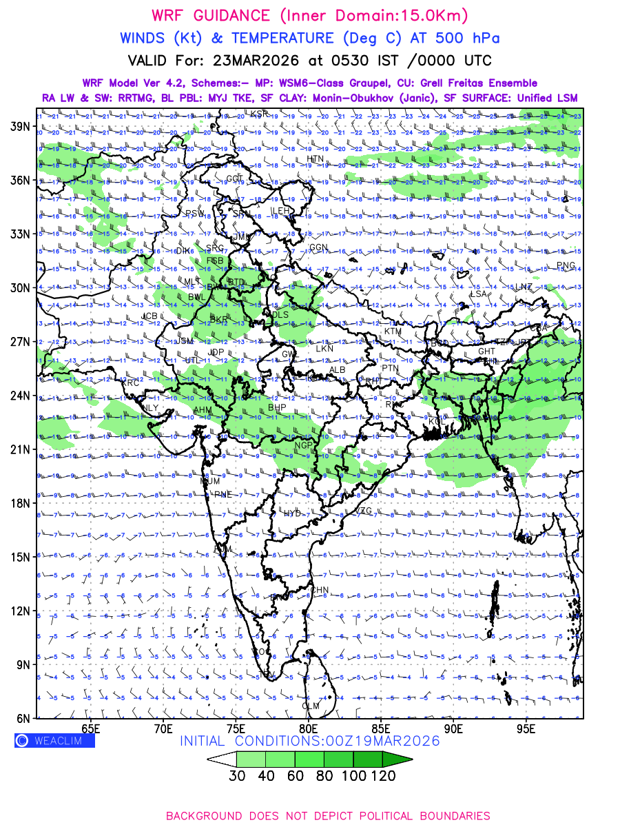 Winds at 500 hPa at the 24th hour generated using WRF Ver 4.2 at a resolution of 15 Km for India refers to the predicted wind direction and speed at a pressure level of 500 hPa, which is located in the upper troposphere about 5.5 km (18,000 ft) above the Earth’s surface. The winds are presented in knots (kt), and the direction is given in degrees from true north. Winds with magnitude of more than 40 kt are marked in shades of green. It provides important information on forecasting weather patterns, including the movement and intensification of storms, the development of weather fronts, and the location and strength of high and low pressure systems. The depiction also shows the temperature along with the wind barb on the grid points at 500 hPa. Along with the wind speed (kt) and direction, upper air temperatures (Deg C) are also shown at the grid points over the Indian Region at 500 hPa level for the next four days.