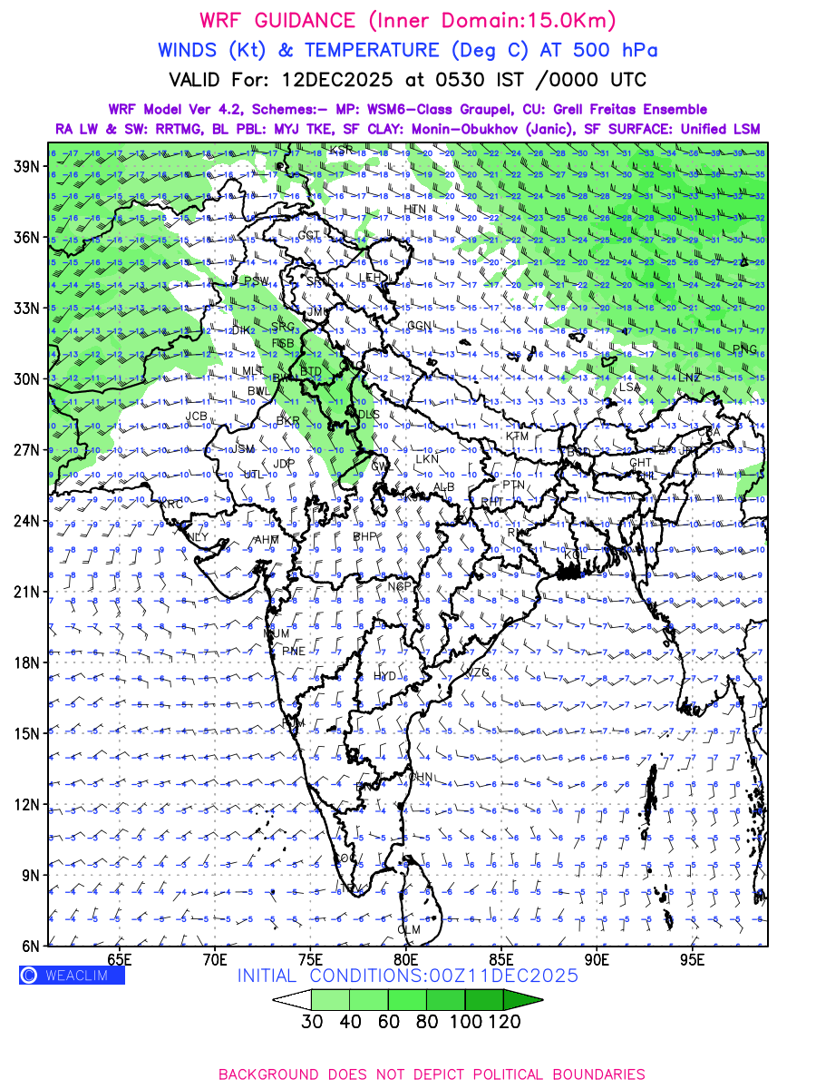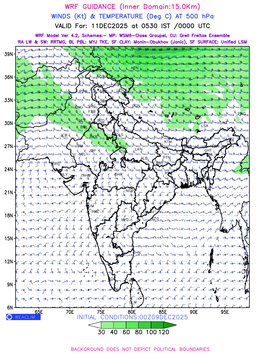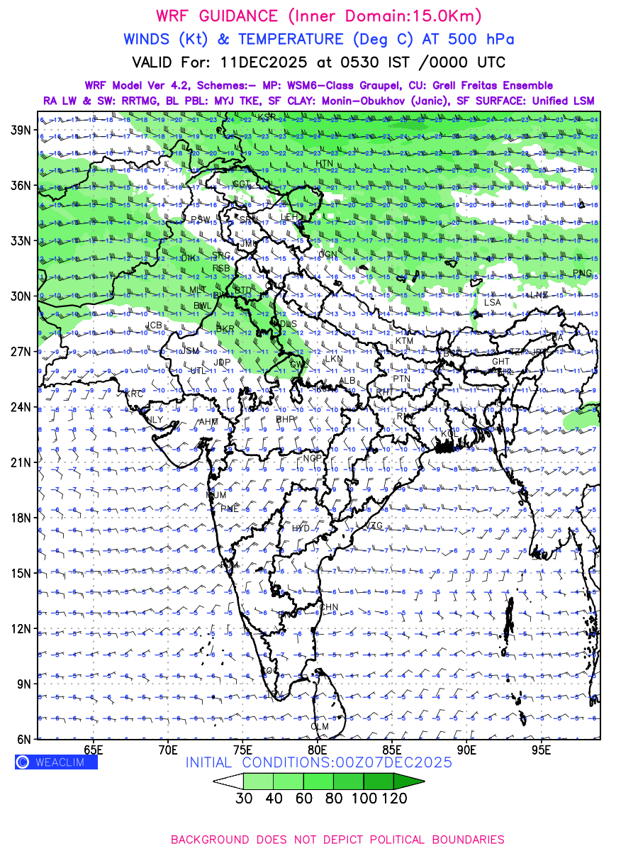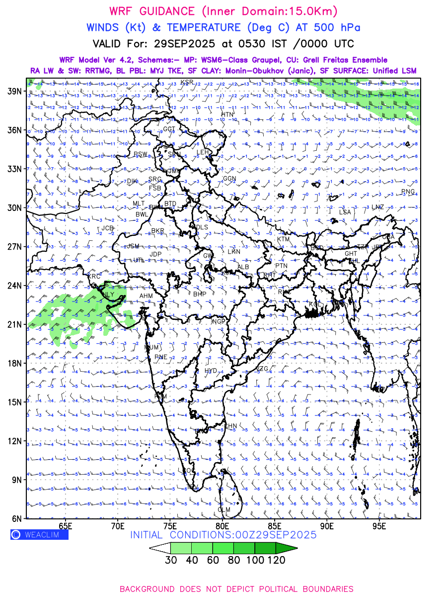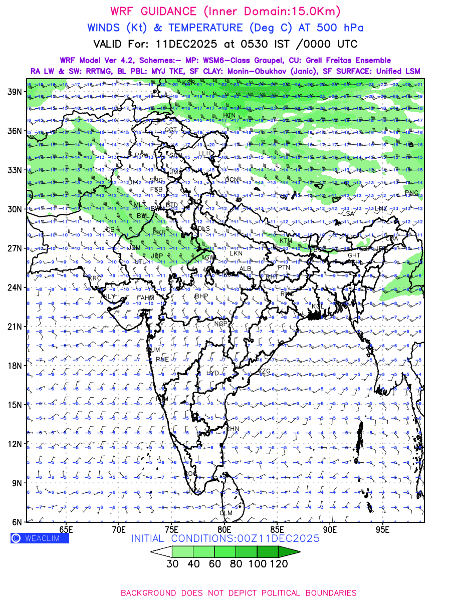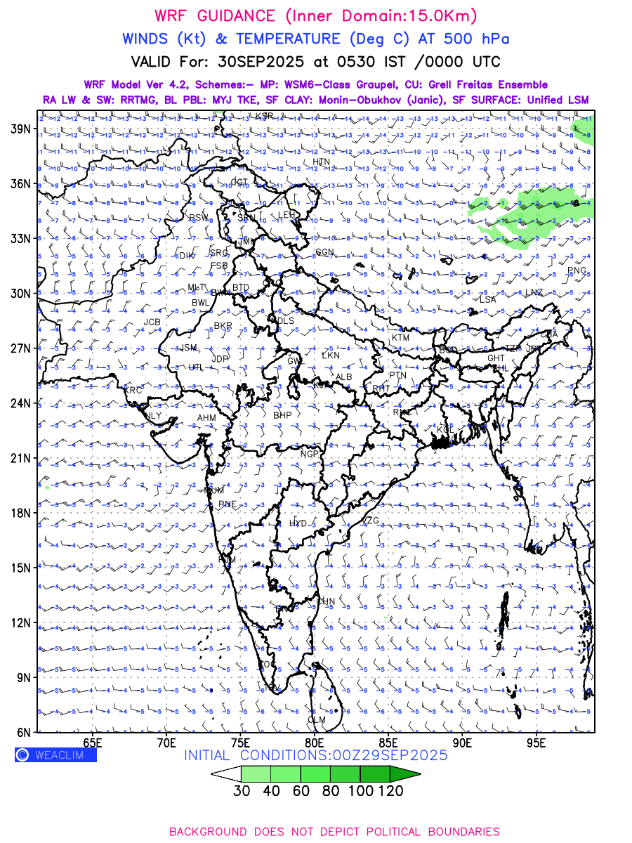 Winds at 500 hPa at the 24th hour generated using WRF Ver 4.2 at a resolution of 15 Km for India refers to the predicted wind direction and speed at a pressure level of 500 hPa, which is located in the upper troposphere about 5.5 km (18,000 ft) above the Earth’s surface. The winds are presented in knots (kt), and the direction is given in degrees from true north. Winds with magnitude of more than 40 kt are marked in shades of green. It provides important information on forecasting weather patterns, including the movement and intensification of storms, the development of weather fronts, and the location and strength of high and low pressure systems. The depiction also shows the temperature along with the wind barb on the grid points at 500 hPa. Along with the wind speed (kt) and direction, upper air temperatures (Deg C) are also shown at the grid points over the Indian Region at 500 hPa level for the next four days.
