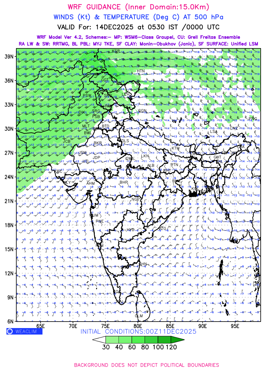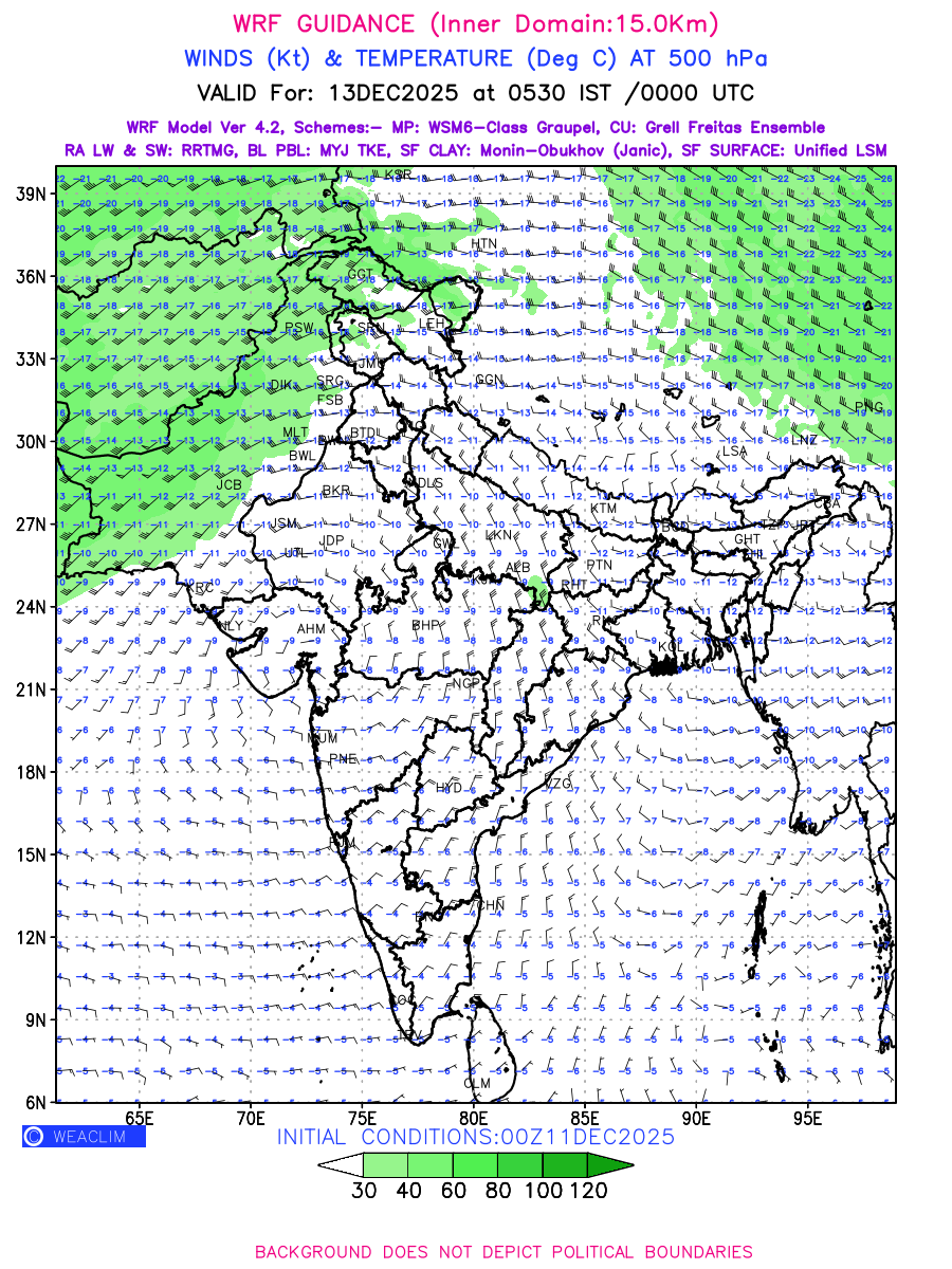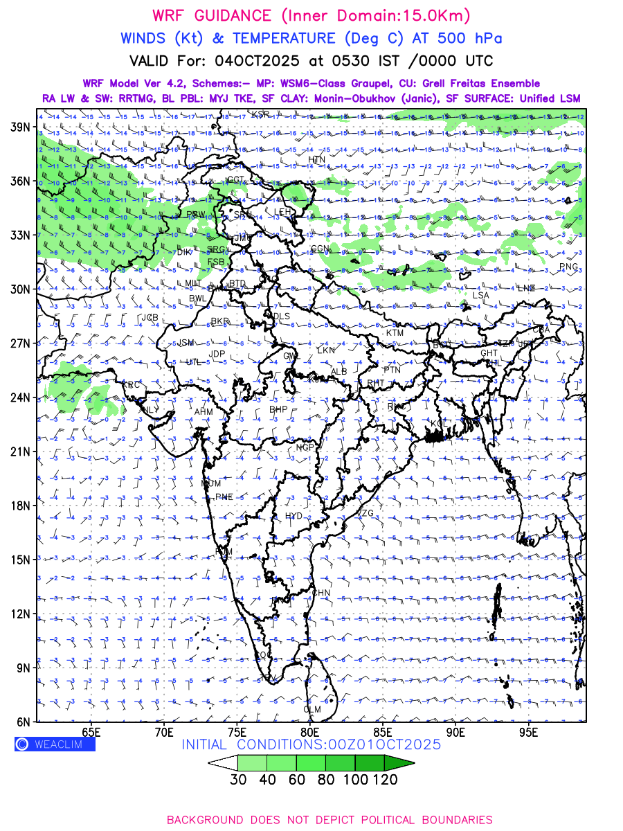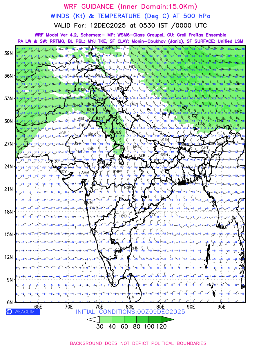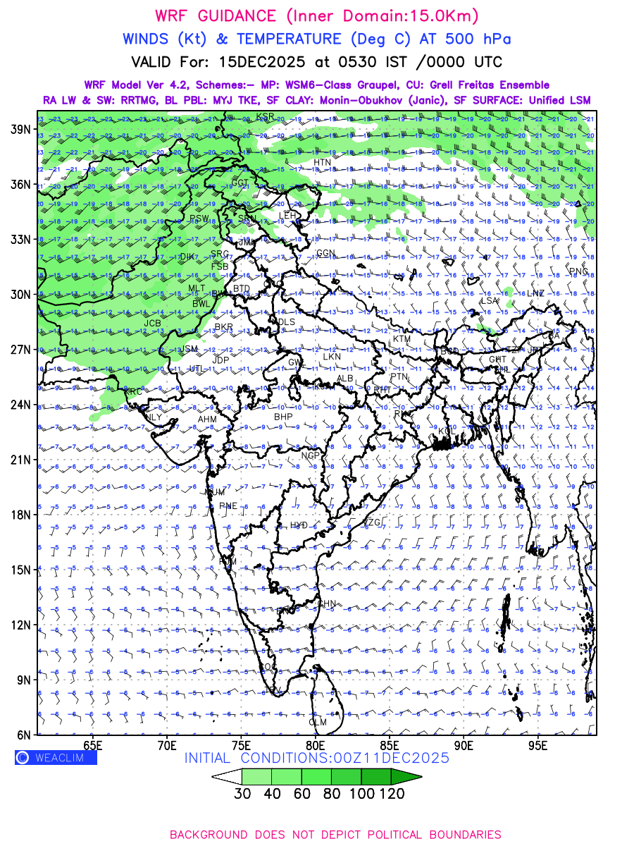 Winds at 500 hPa at the 24th hour generated using WRF Ver 4.2 at a resolution of 15 Km for India refers to the predicted wind direction and speed at a pressure level of 500 hPa, which is located in the upper troposphere about 5.5 km (18,000 ft) above the Earth’s surface. The winds are presented in knots (kt), and the direction is given in degrees from true north. Winds with magnitude of more than 40 kt are marked in shades of green. It provides important information on forecasting weather patterns, including the movement and intensification of storms, the development of weather fronts, and the location and strength of high and low pressure systems. The depiction also shows the temperature along with the wind barb on the grid points at 500 hPa. Along with the wind speed (kt) and direction, upper air temperatures (Deg C) are also shown at the grid points over the Indian Region at 500 hPa level for the next four days.