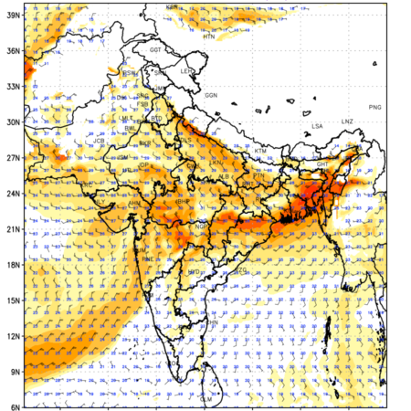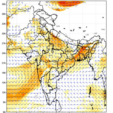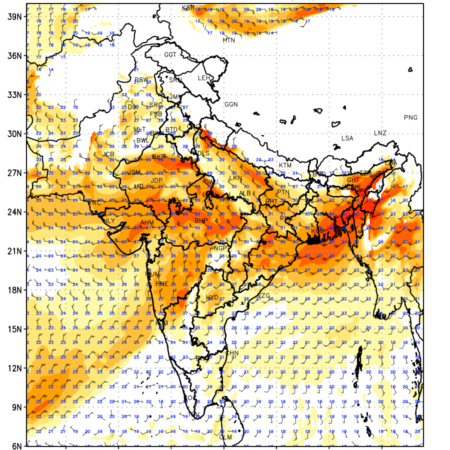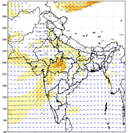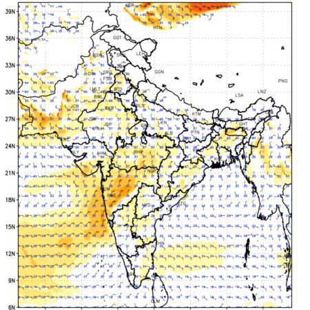 Winds at 850 hPa at the 24th hour generated using WRF Ver 4.2 at a resolution of 15 Km for India refers to the predicted wind direction and speed at a pressure level of 850 hPa, which is located in the lower troposphere (1,500 meters or 5,000 feet above the Earth’s surface). The winds are presented in knots (kt), and the direction is given in degrees from true north. Winds with magnitude of more than 20 kt are marked in shades of red. Being close to the Earth’s surface it is strongly influenced by surface features such as mountains, valleys, and bodies of water. It gives insight into the strength and direction of wind flow in the lower troposphere, affecting the movement of weather systems and the transport of heat, moisture, and pollutants in the atmosphere. Along with the wind speed (kt) and direction, upper air temperatures (Deg C) are also shown at the grid points over the Indian Region at 850 hPa level for the next four days.
