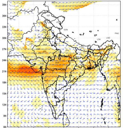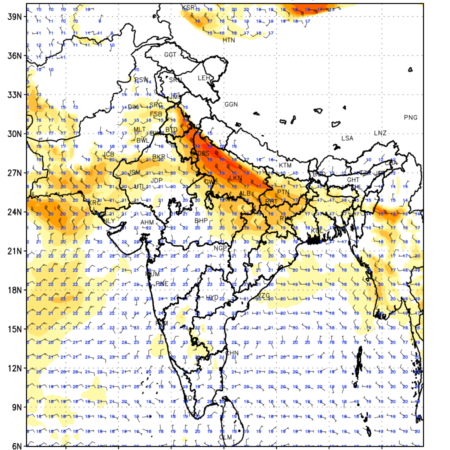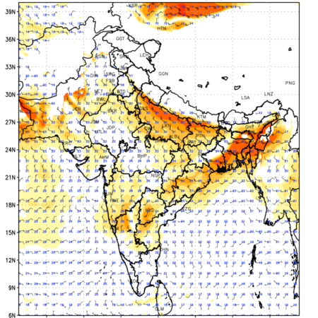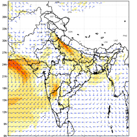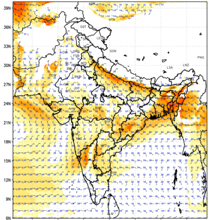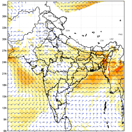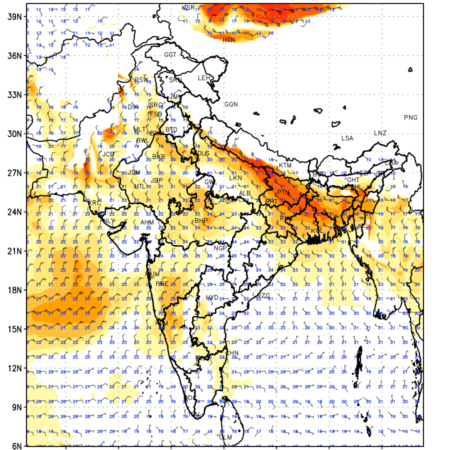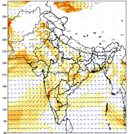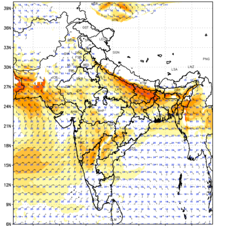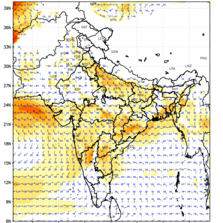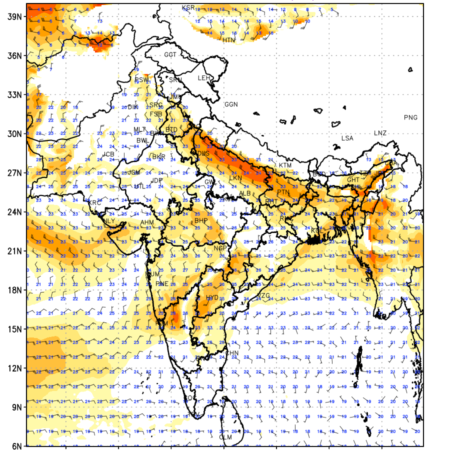 Winds at 850 hPa at the 24th hour generated using WRF Ver 4.2 at a resolution of 15 Km for India refers to the predicted wind direction and speed at a pressure level of 850 hPa, which is located in the lower troposphere (1,500 meters or 5,000 feet above the Earth’s surface). The winds are presented in knots (kt), and the direction is given in degrees from true north. Winds with magnitude of more than 20 kt are marked in shades of red. Being close to the Earth’s surface it is strongly influenced by surface features such as mountains, valleys, and bodies of water. It gives insight into the strength and direction of wind flow in the lower troposphere, affecting the movement of weather systems and the transport of heat, moisture, and pollutants in the atmosphere. Along with the wind speed (kt) and direction, upper air temperatures (Deg C) are also shown at the grid points over the Indian Region at 850 hPa level for the next four days.