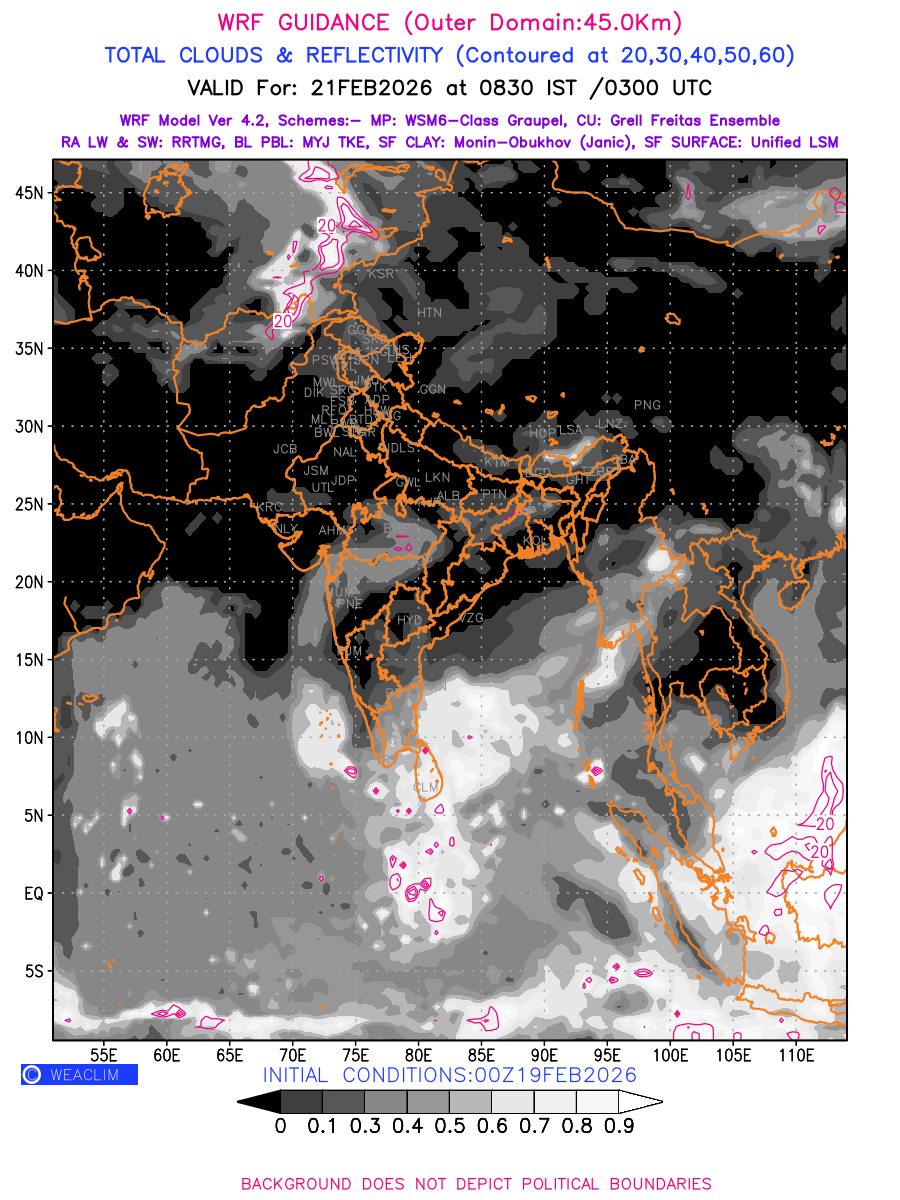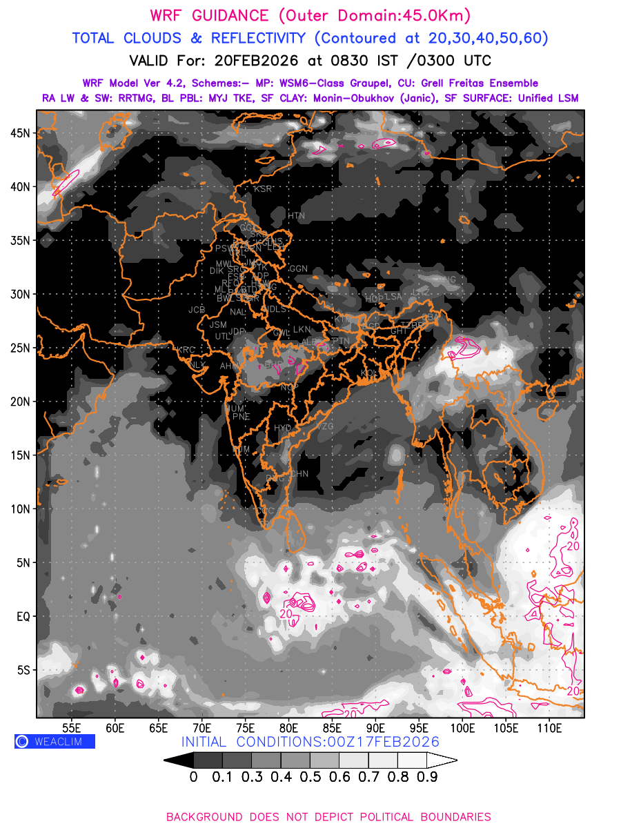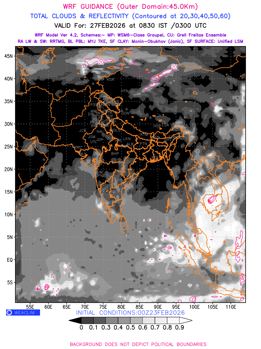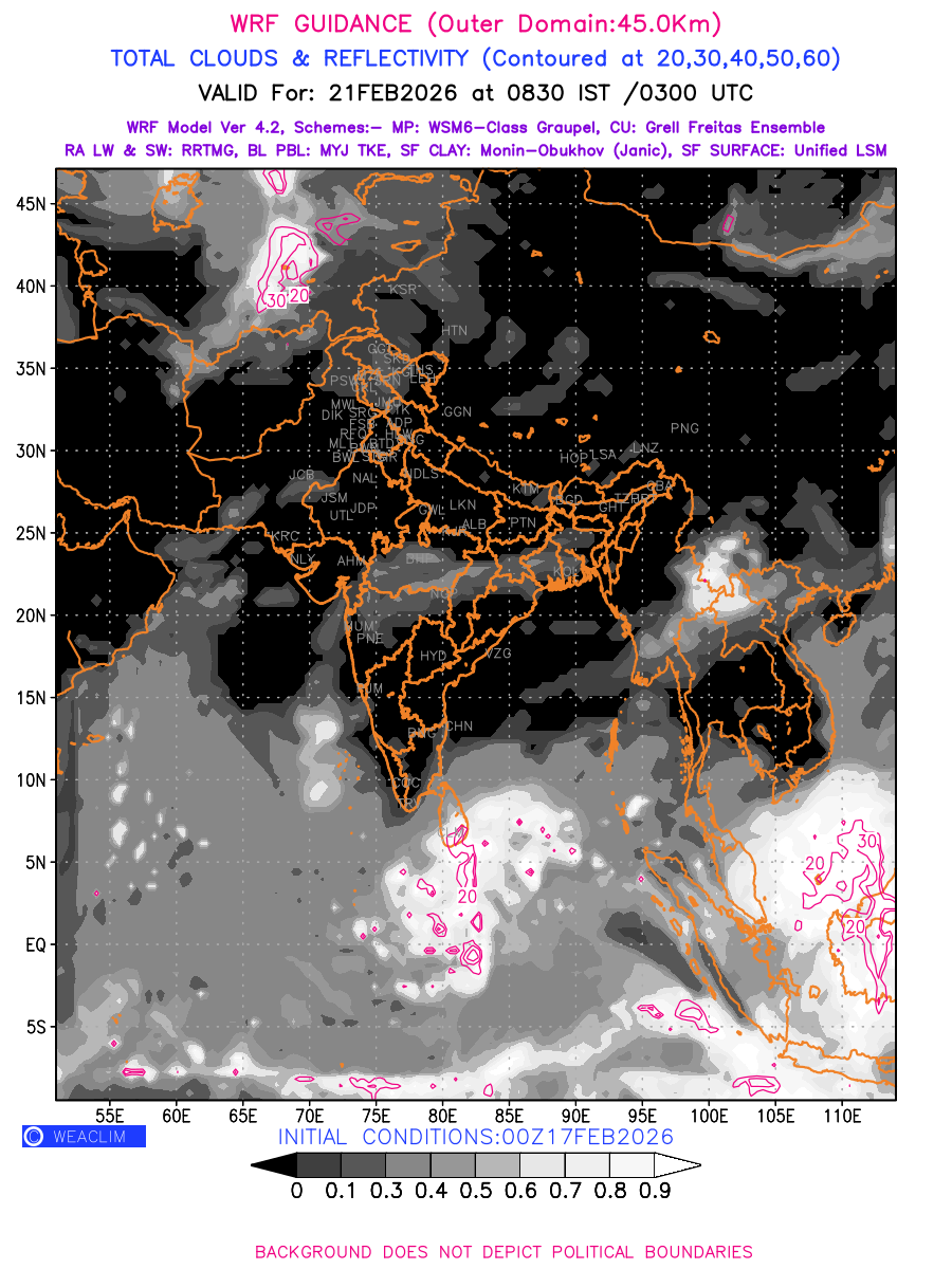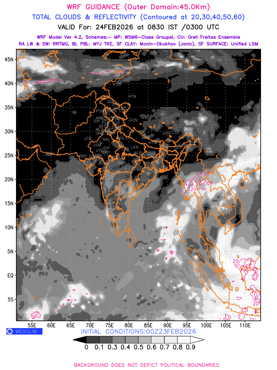 Cloud forecast at the 24 th hour generated using WRF Ver 4.2 at a resolution of 45 Km for India is the predicted pattern of clouds and percentage of the sky covered by them akin to an InfraRed Imagery given by the meteorological satellites. Convective clouds are formed by the vertical movement of air in the atmosphere and are associated with thunderstorms and other types of severe weather like intense rainfall, strong gusty winds, low clouds etc. The charts use shading from black to white with whiter shade depicting more intensity of convection on a scale ranging between 0 to 1. Also shown is the Maximum Reflectivity that takes the maximum reflectivity from each elevation angle of the Doppler Weather Radar and meshes it into one image.  Advantage of this type of image is the ability to quickly assess the intensity of storms. Predicted pattern of Total Clouds and percentage of the sky covered by them is shown here along with Maximum Reflectivity over the Indian Region and its neighbourhood for the next four days.