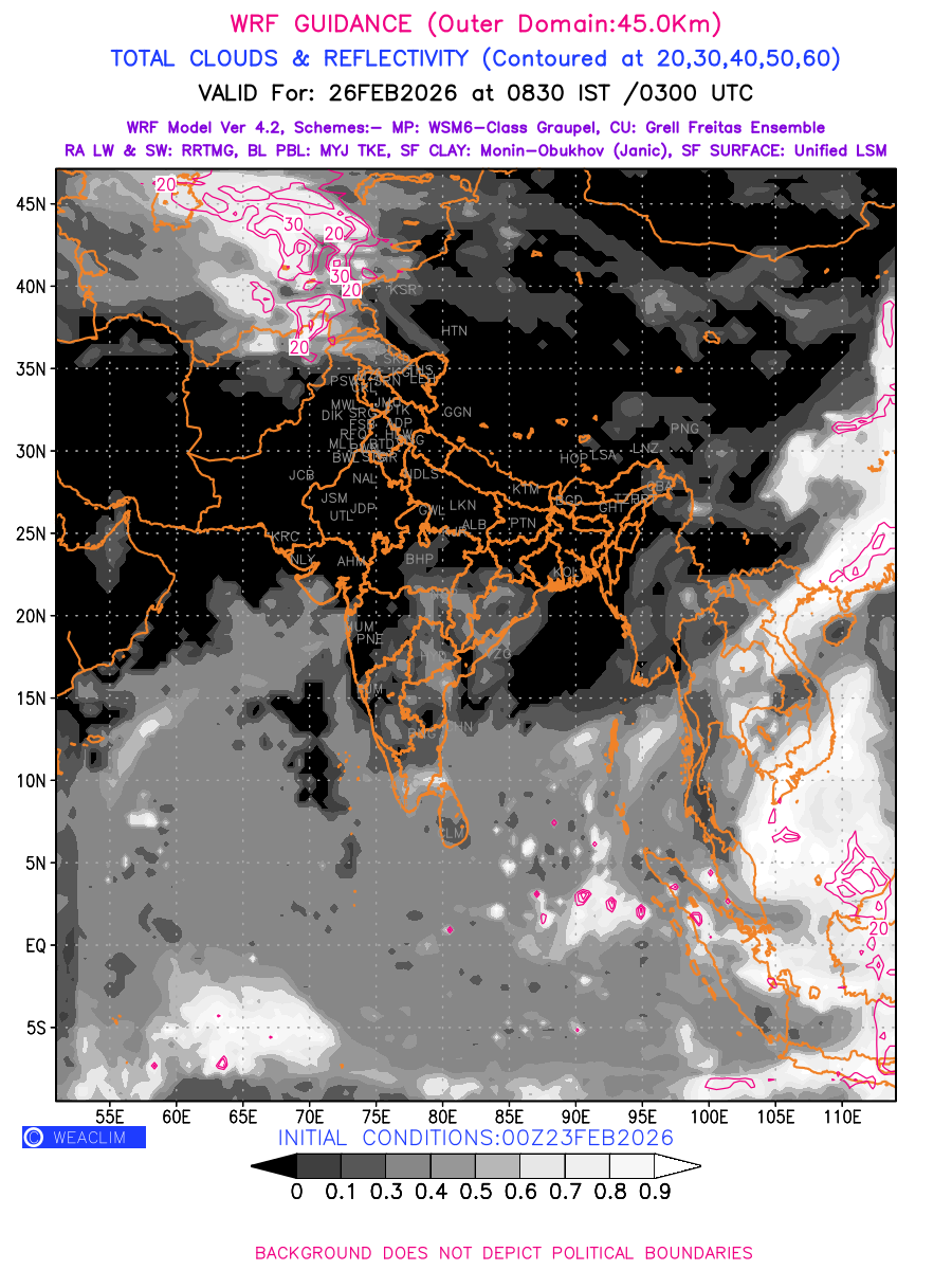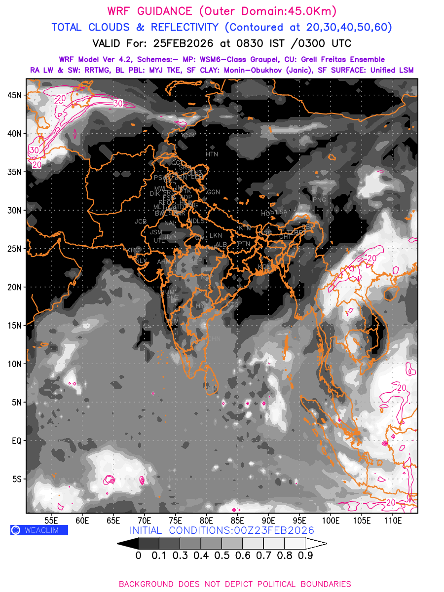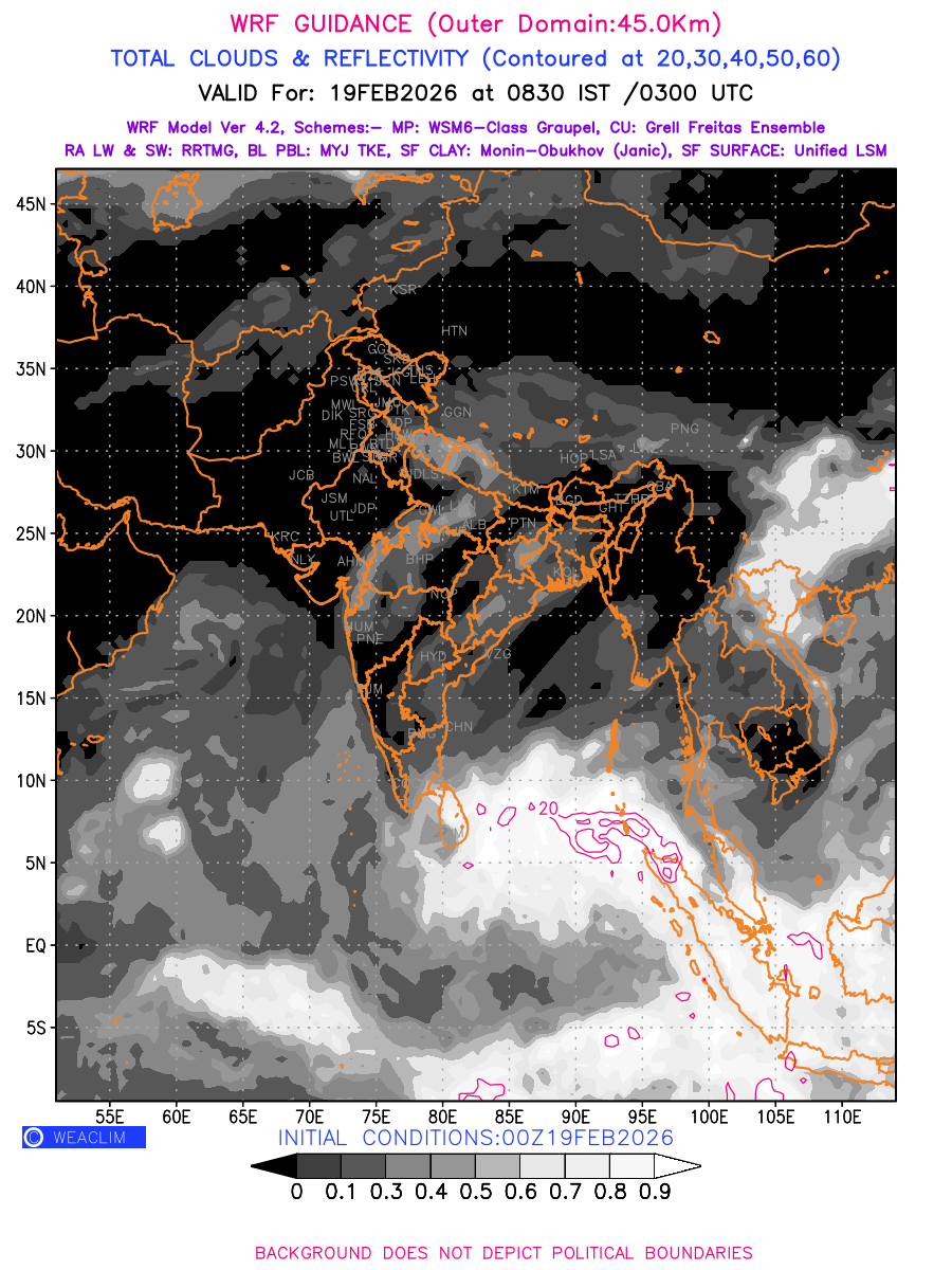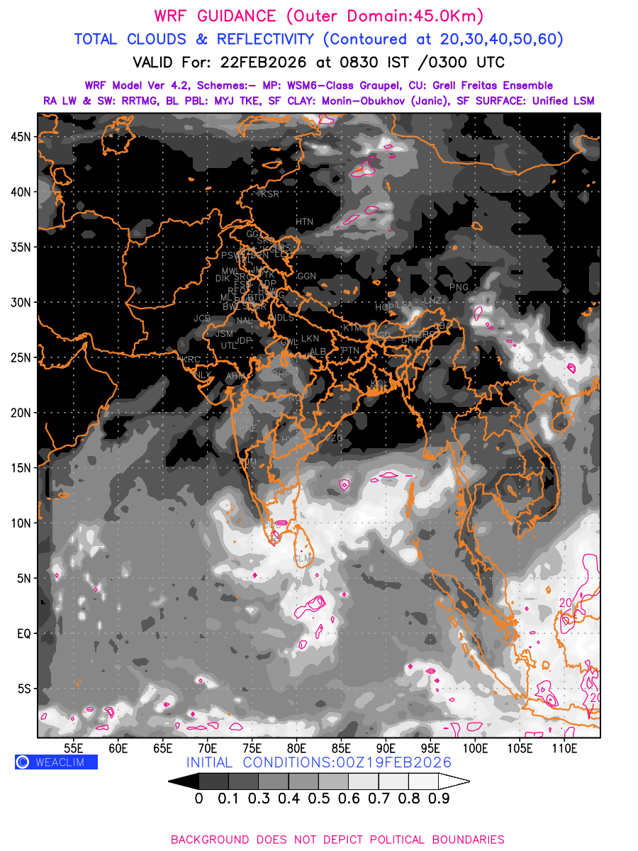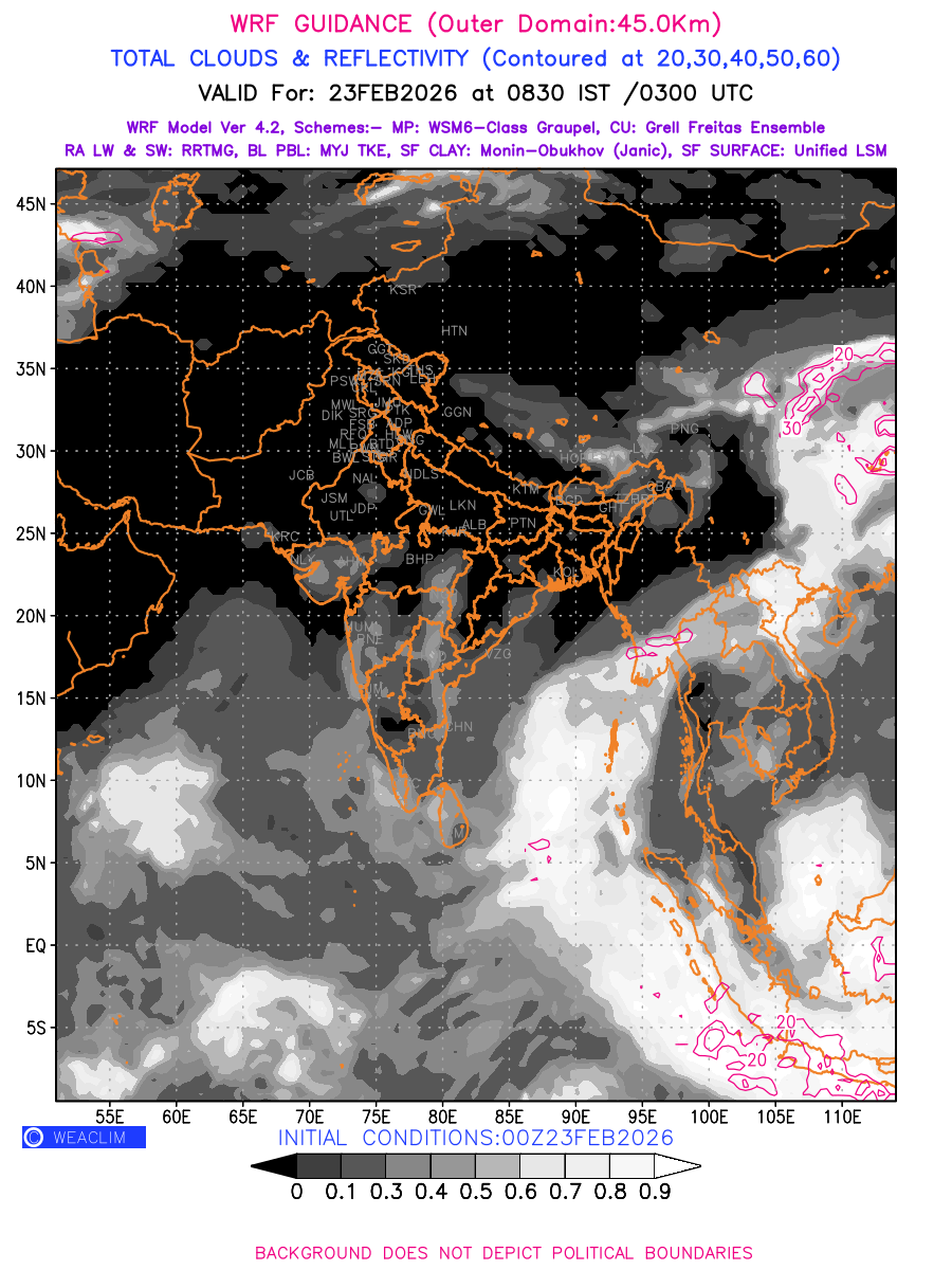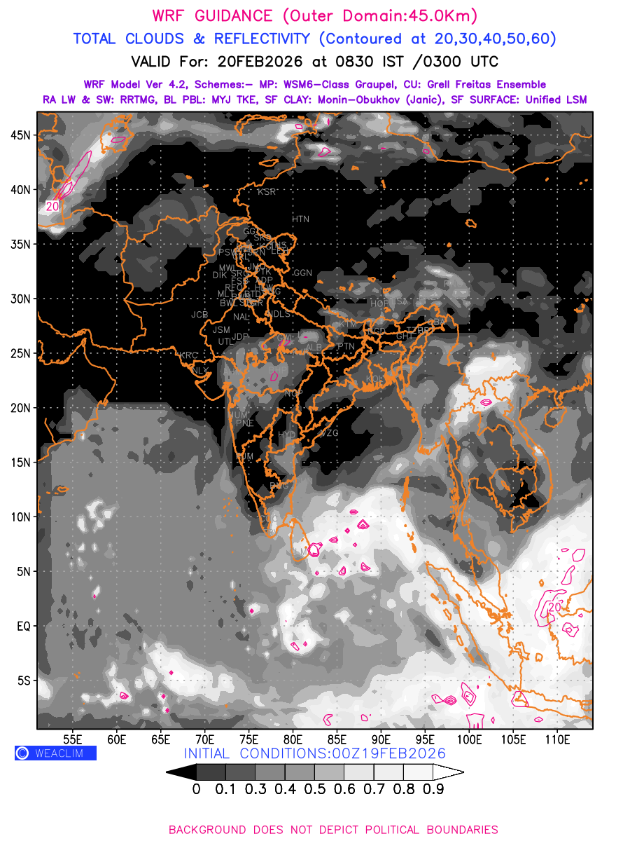 Cloud forecast at the 24 th hour generated using WRF Ver 4.2 at a resolution of 45 Km for India is the predicted pattern of clouds and percentage of the sky covered by them akin to an InfraRed Imagery given by the meteorological satellites. Convective clouds are formed by the vertical movement of air in the atmosphere and are associated with thunderstorms and other types of severe weather like intense rainfall, strong gusty winds, low clouds etc. The charts use shading from black to white with whiter shade depicting more intensity of convection on a scale ranging between 0 to 1. Also shown is the Maximum Reflectivity that takes the maximum reflectivity from each elevation angle of the Doppler Weather Radar and meshes it into one image.  Advantage of this type of image is the ability to quickly assess the intensity of storms. Predicted pattern of Total Clouds and percentage of the sky covered by them is shown here along with Maximum Reflectivity over the Indian Region and its neighbourhood for the next four days.