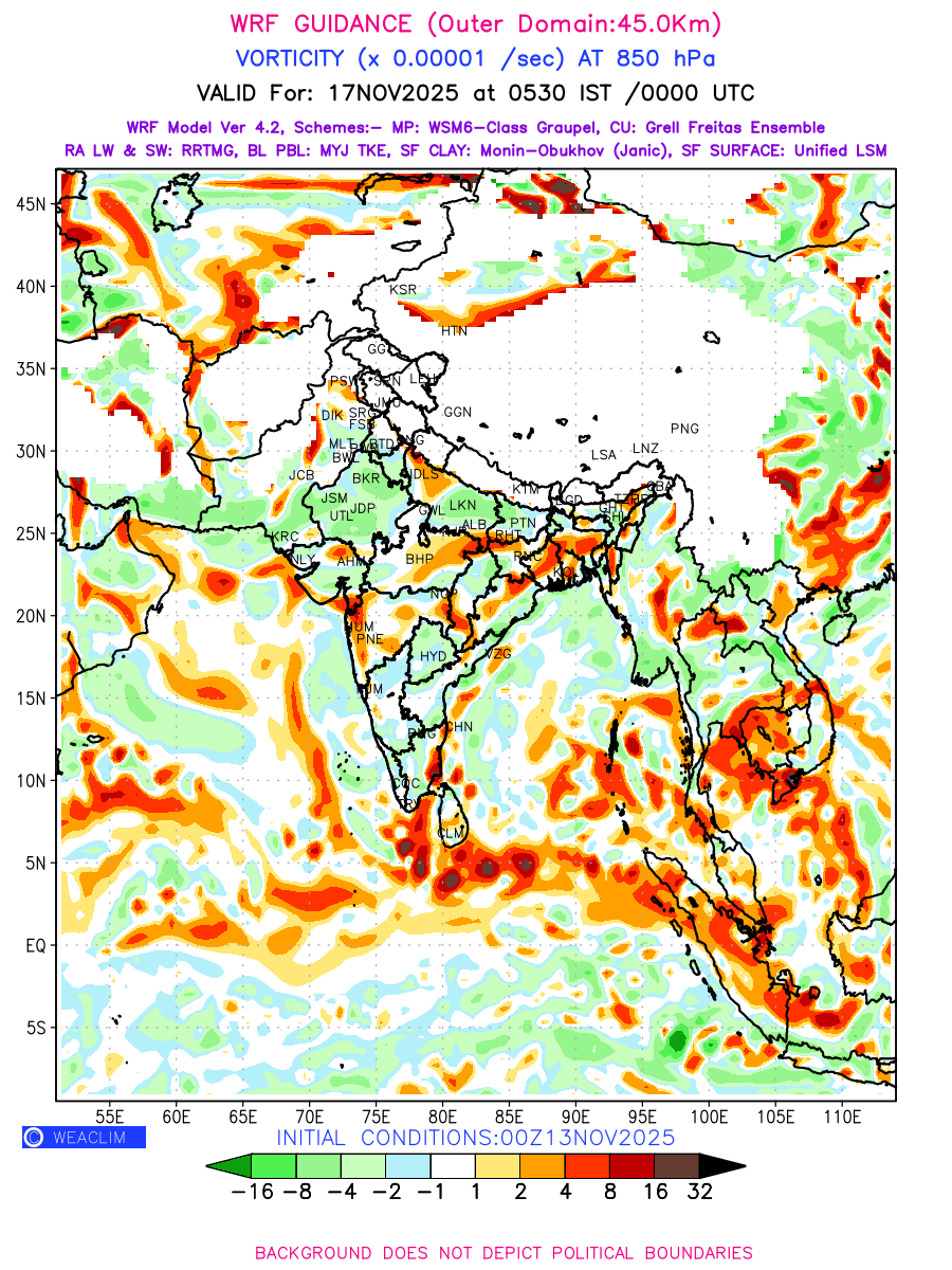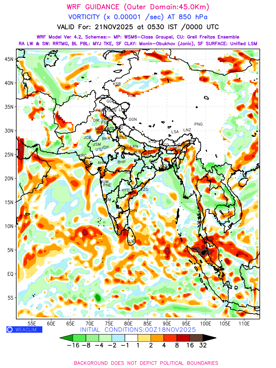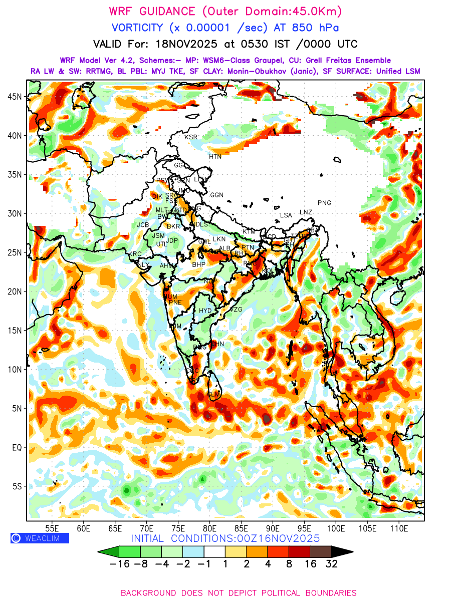 Low Level Convergence at the 24 th hour generated using WRF Ver 4.2 at a resolution of 45 Km for India is the graphical representation of the expected magnitude and pattern of horizontal rotation (or the vorticity) of atmosphere around a vertical axis or the vorticity at 850 hPa (1.5km). It is typically displayed with warm colors ranging from shades of red (to yellow) indicating positive vorticity (cyclonic rotation), and cool colors shades of green (to blue) indicating negative vorticity (anticyclonic rotation). They are useful in identifying areas of high and low vorticity, associated with weather systems such as fronts, lows, and highs etc.