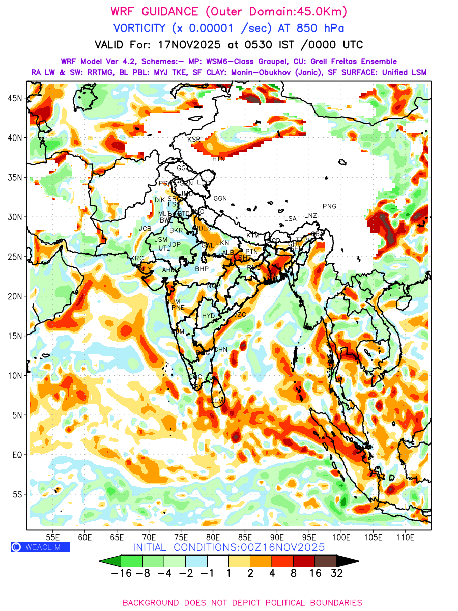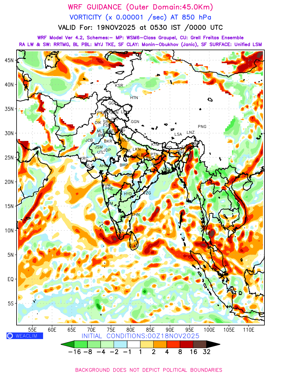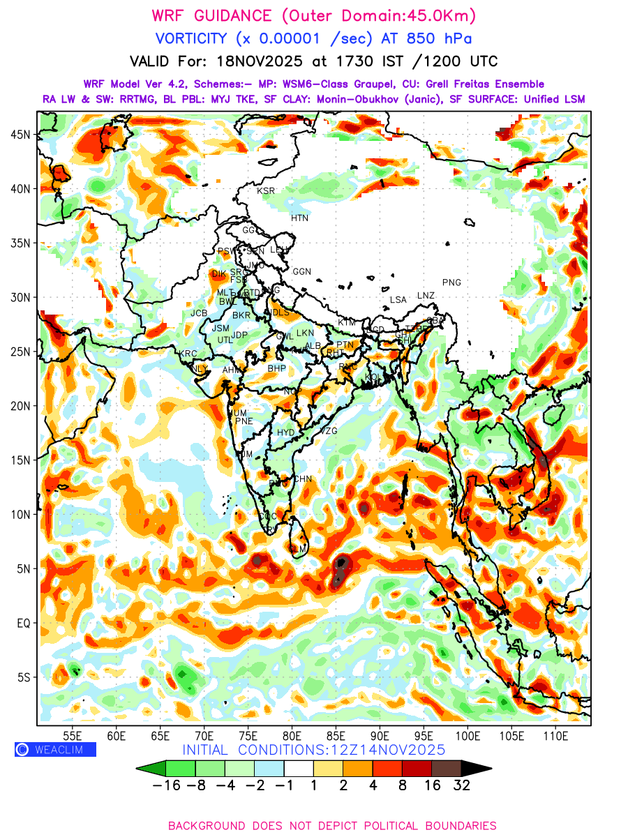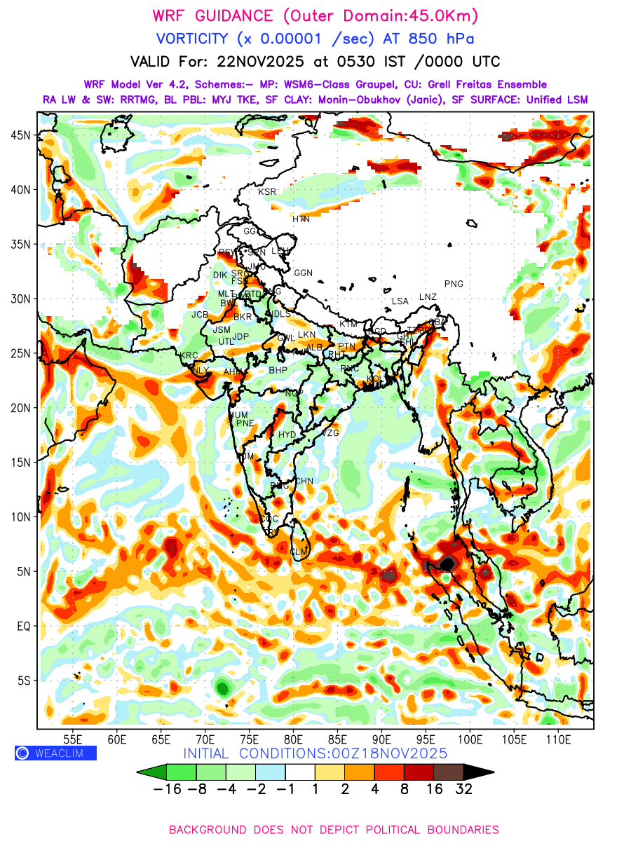 Low Level Convergence at the 24 th hour generated using WRF Ver 4.2 at a resolution of 45 Km for India is the graphical representation of the expected magnitude and pattern of horizontal rotation (or the vorticity) of atmosphere around a vertical axis or the vorticity at 850 hPa (1.5km). It is typically displayed with warm colors ranging from shades of red (to yellow) indicating positive vorticity (cyclonic rotation), and cool colors shades of green (to blue) indicating negative vorticity (anticyclonic rotation). They are useful in identifying areas of high and low vorticity, associated with weather systems such as fronts, lows, and highs etc.