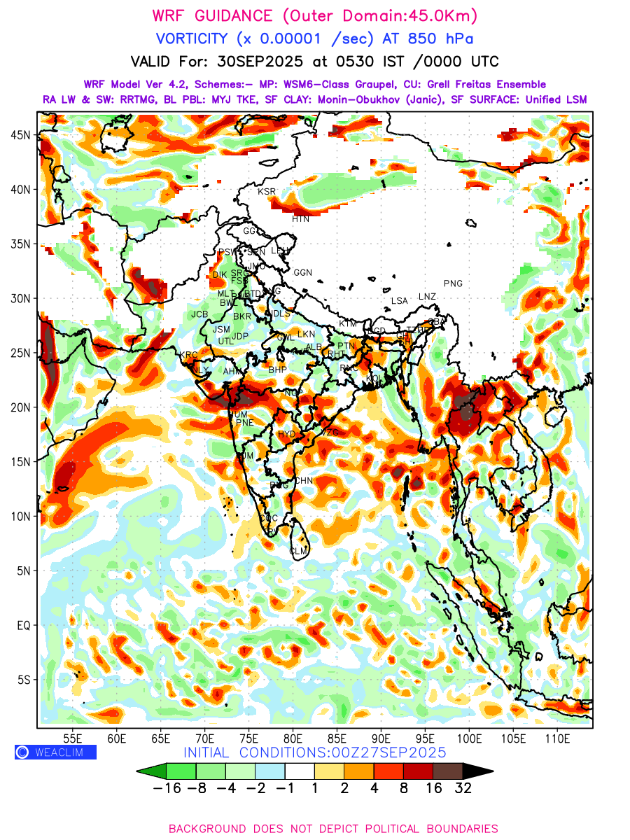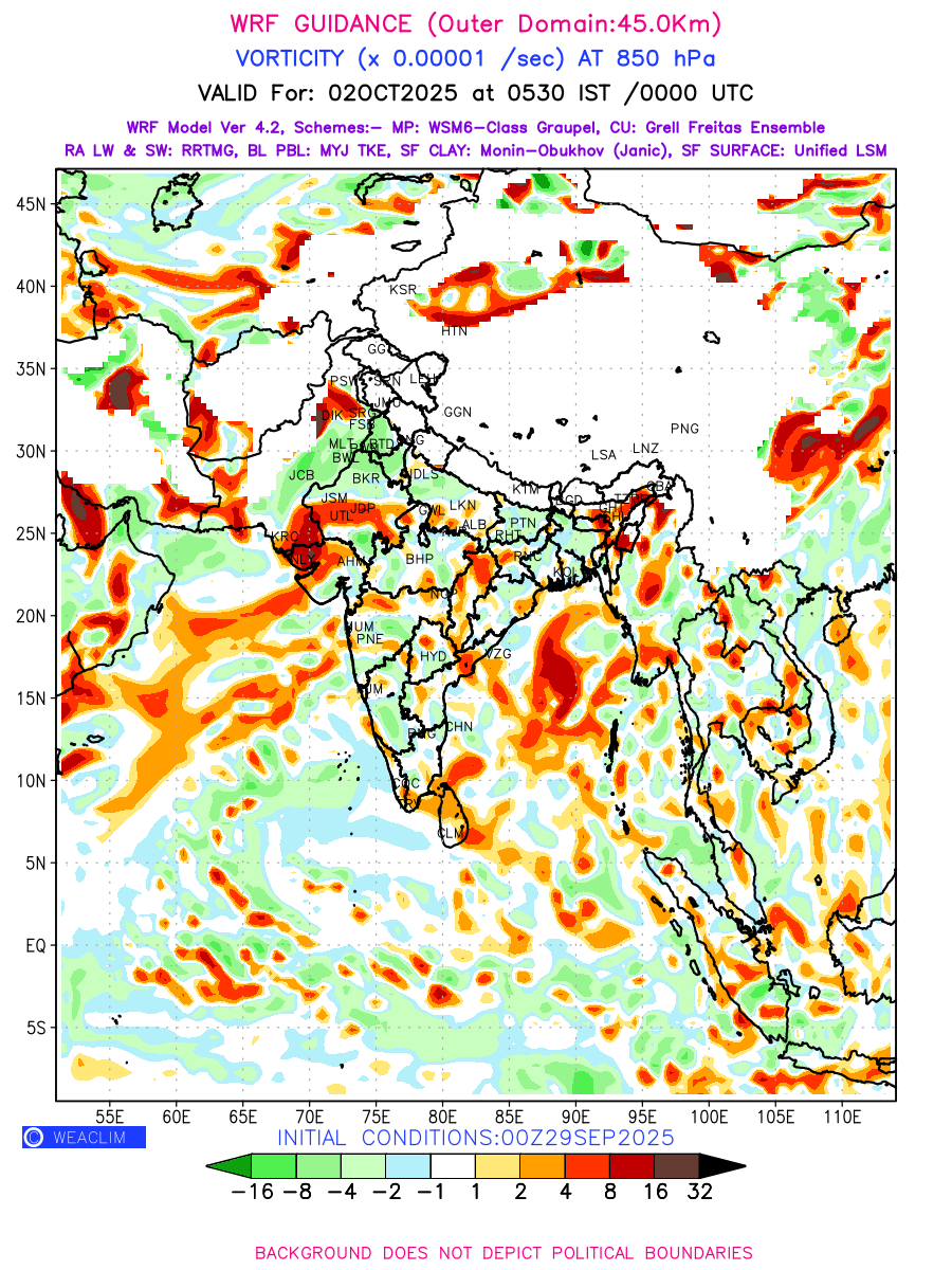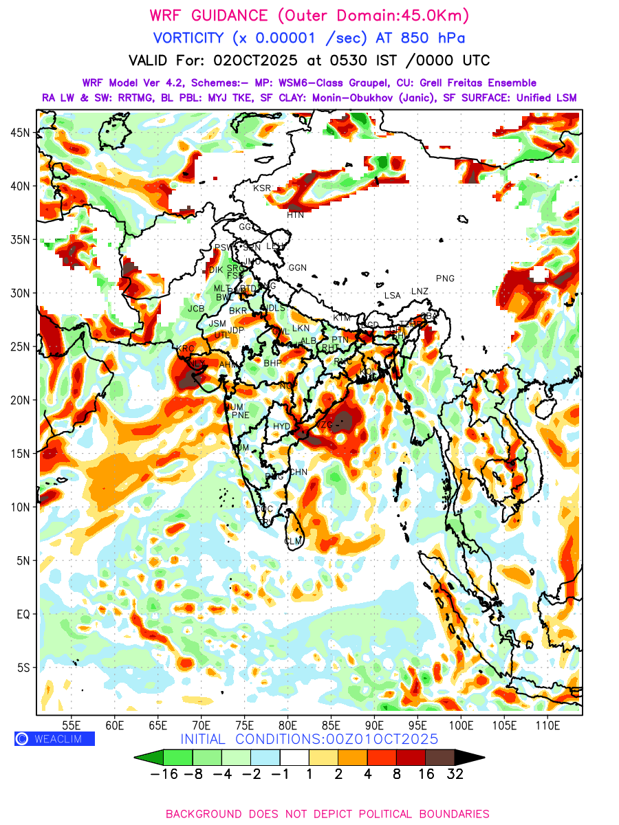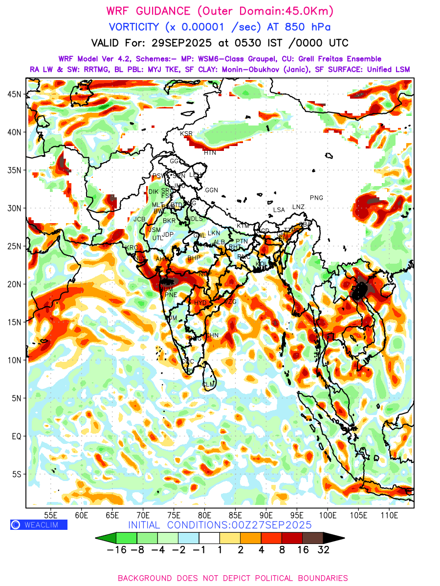 Low Level Convergence at the 24 th hour generated using WRF Ver 4.2 at a resolution of 45 Km for India is the graphical representation of the expected magnitude and pattern of horizontal rotation (or the vorticity) of atmosphere around a vertical axis or the vorticity at 850 hPa (1.5km). It is typically displayed with warm colors ranging from shades of red (to yellow) indicating positive vorticity (cyclonic rotation), and cool colors shades of green (to blue) indicating negative vorticity (anticyclonic rotation). They are useful in identifying areas of high and low vorticity, associated with weather systems such as fronts, lows, and highs etc.