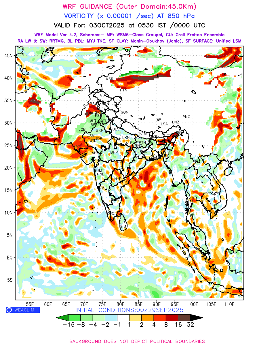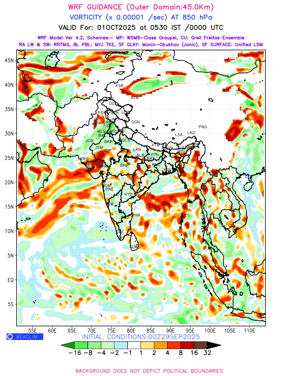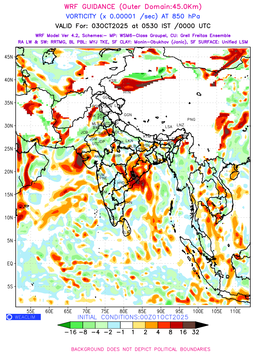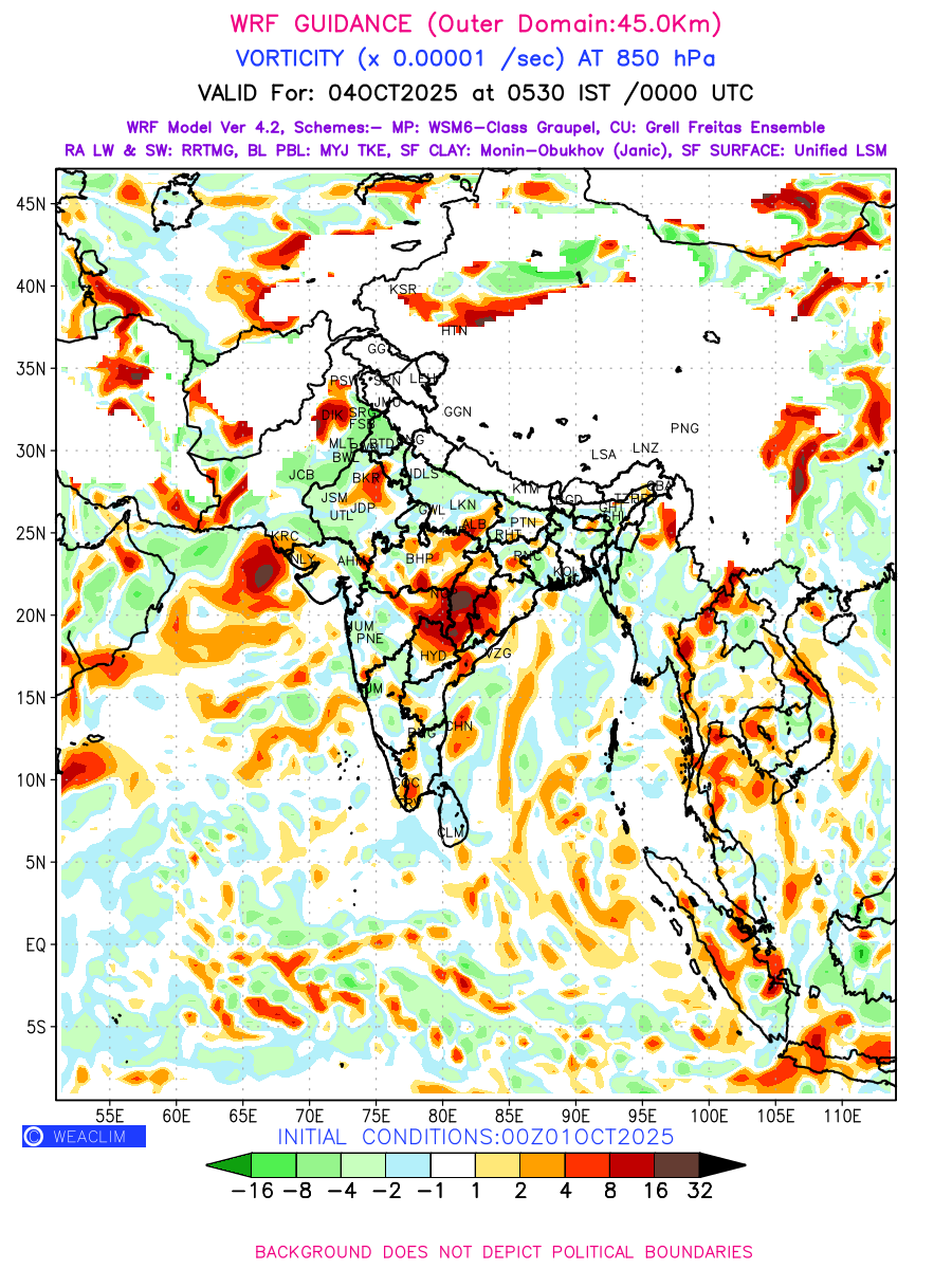 Low Level Convergence at the 24 th hour generated using WRF Ver 4.2 at a resolution of 45 Km for India is the graphical representation of the expected magnitude and pattern of horizontal rotation (or the vorticity) of atmosphere around a vertical axis or the vorticity at 850 hPa (1.5km). It is typically displayed with warm colors ranging from shades of red (to yellow) indicating positive vorticity (cyclonic rotation), and cool colors shades of green (to blue) indicating negative vorticity (anticyclonic rotation). They are useful in identifying areas of high and low vorticity, associated with weather systems such as fronts, lows, and highs etc.