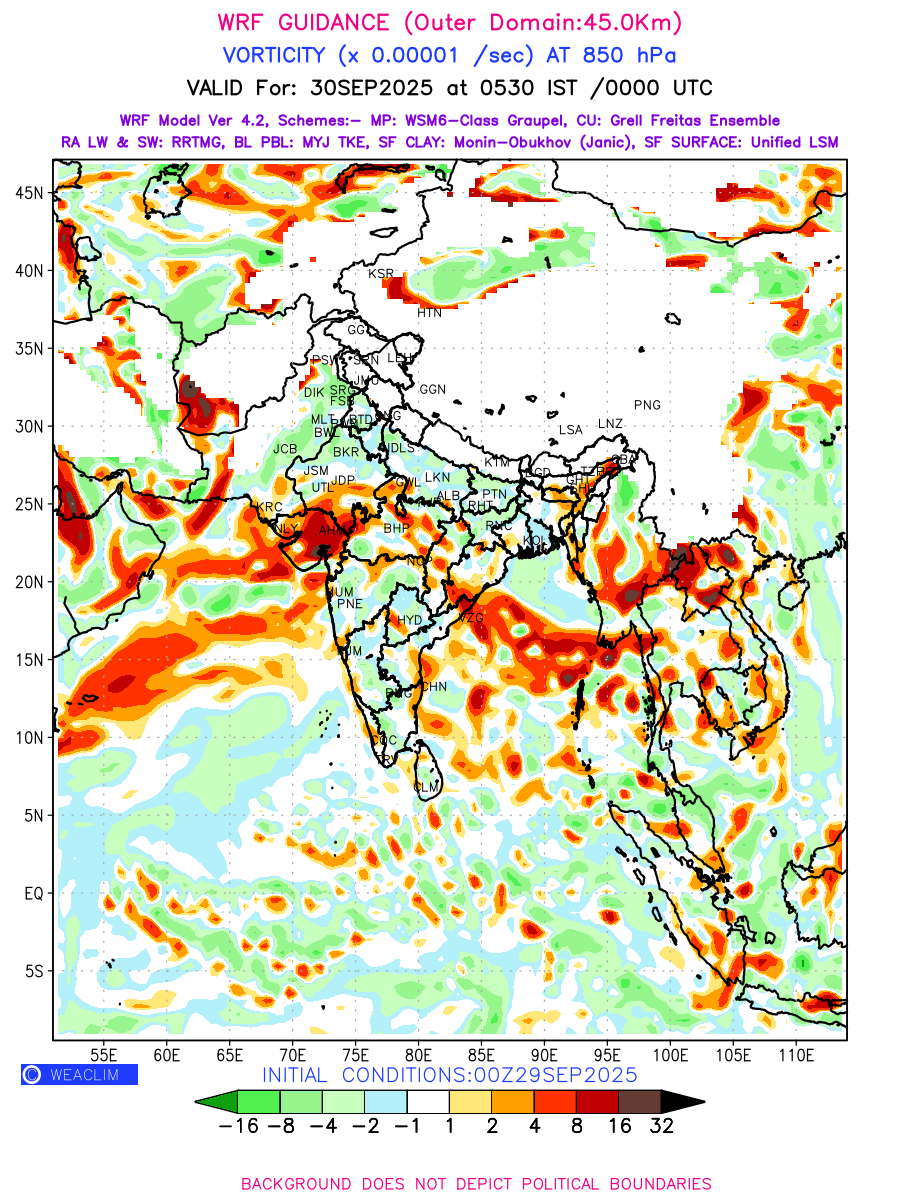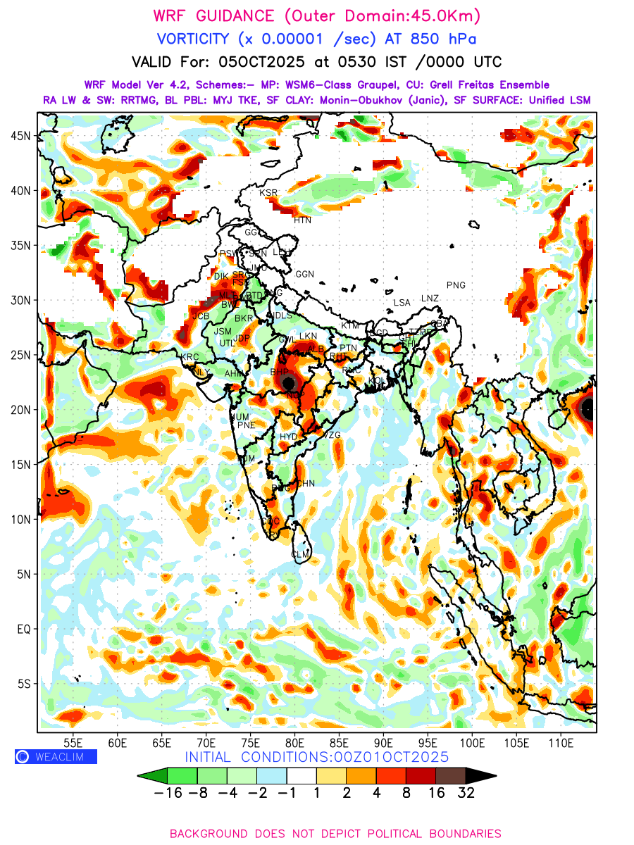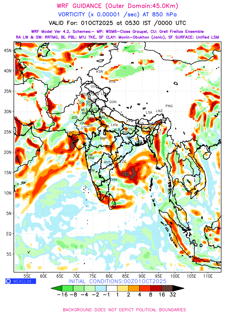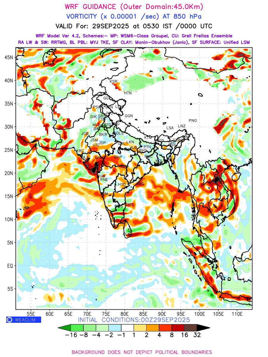 Low Level Convergence at the 24 th hour generated using WRF Ver 4.2 at a resolution of 45 Km for India is the graphical representation of the expected magnitude and pattern of horizontal rotation (or the vorticity) of atmosphere around a vertical axis or the vorticity at 850 hPa (1.5km). It is typically displayed with warm colors ranging from shades of red (to yellow) indicating positive vorticity (cyclonic rotation), and cool colors shades of green (to blue) indicating negative vorticity (anticyclonic rotation). They are useful in identifying areas of high and low vorticity, associated with weather systems such as fronts, lows, and highs etc.