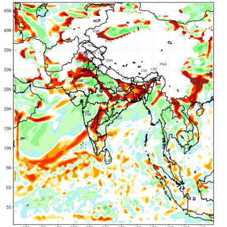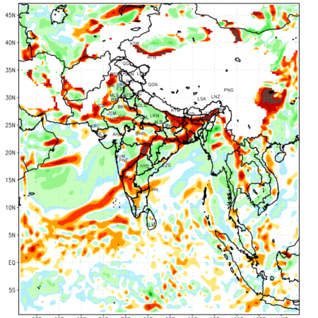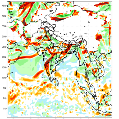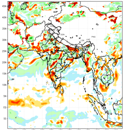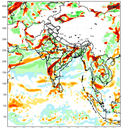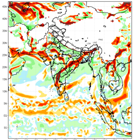 Low Level Convergence at the 24 th hour generated using WRF Ver 4.2 at a resolution of 45 Km for India is the graphical representation of the expected magnitude and pattern of horizontal rotation (or the vorticity) of atmosphere around a vertical axis or the vorticity at 850 hPa (1.5km). It is typically displayed with warm colors ranging from shades of red (to yellow) indicating positive vorticity (cyclonic rotation), and cool colors shades of green (to blue) indicating negative vorticity (anticyclonic rotation). They are useful in identifying areas of high and low vorticity, associated with weather systems such as fronts, lows, and highs etc.