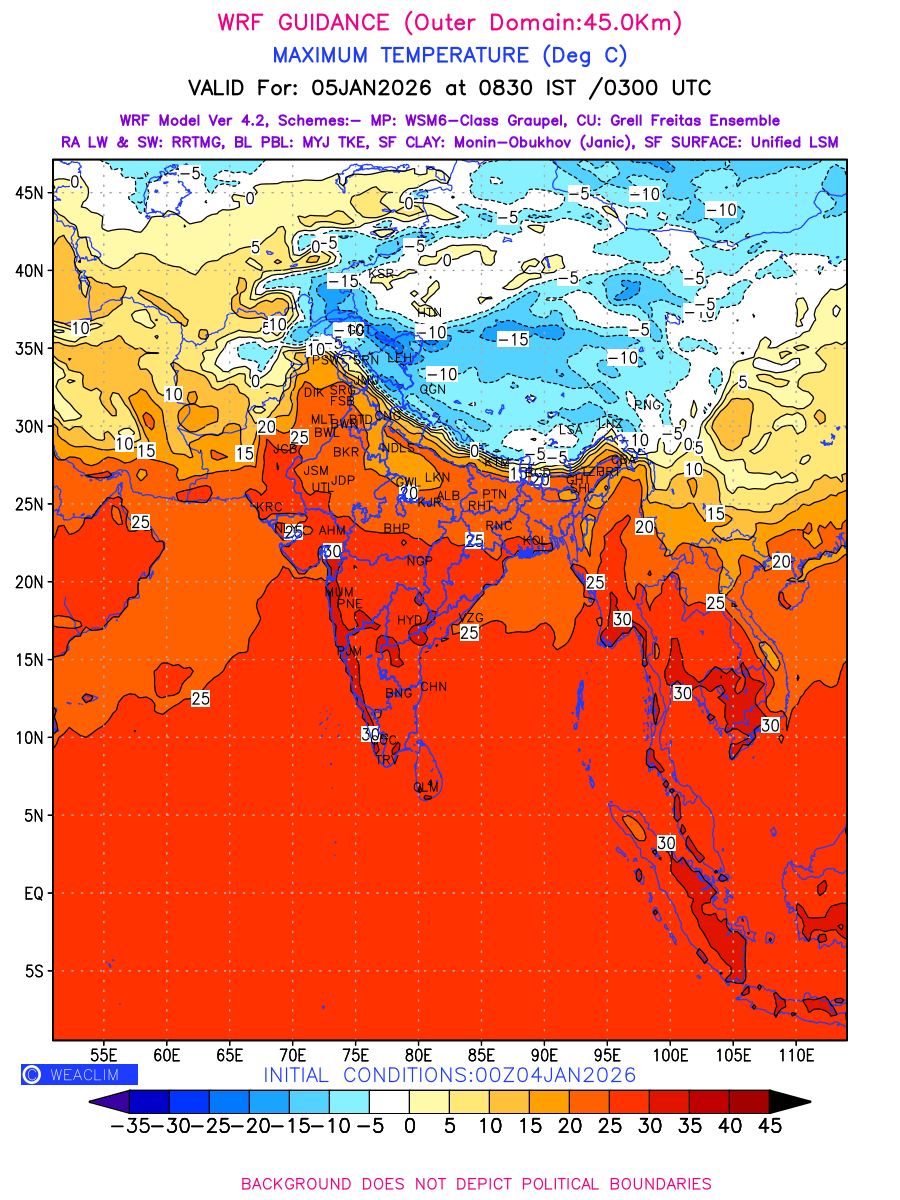 Maximum Temperature generated using WRF Ver 4.2 at a resolution of 45 Km for India depicts the highest temperatures at 2m above the ground surface between 0300 UTC of the previous date to 0300 UTC of the required date. This is an important variable for weather forecasting, as it determines the conditions at the Earth’s surface during the warmest part of the date, affecting human activities, agriculture, and the environment. 2m Temperature data can be used for a variety of applications, such as predicting the onset of heatwaves or cold spells, forecasting temperature trends, and studying the impact of weather on various systems and processes.