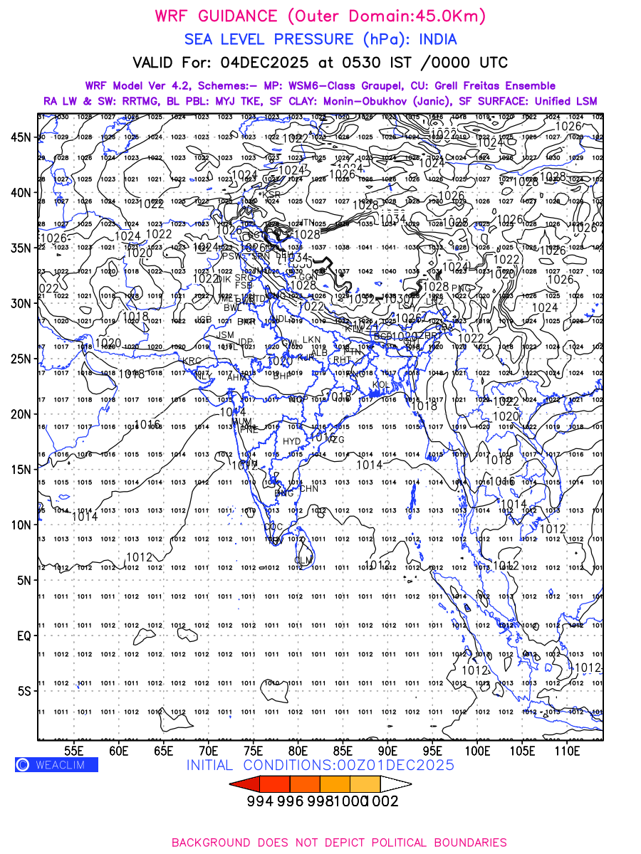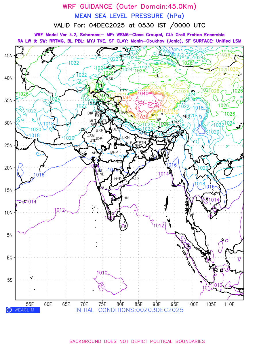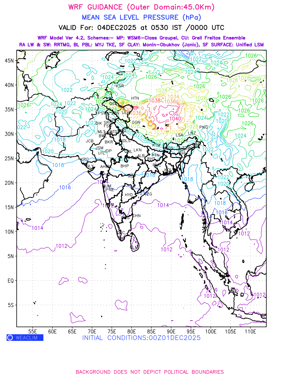 Mean Sea Level Pressure (MSLP) charts at the 24th hour generated using WRF Ver 4.2 at a resolution of 45 Km for India typically show a color-coded contour map of atmospheric pressure at sea level, with lines of equal pressure (isobars) indicating areas of high and low pressure over a geographic area. Meteorologists use these charts to identify areas of high and low pressure, which can give indications of storms, cold fronts, or warm fronts. The MSLP charts are also useful in identifying areas of convergence and divergence in the atmosphere, which can influence the formation or decay of weather systems.