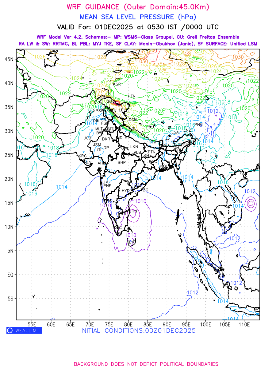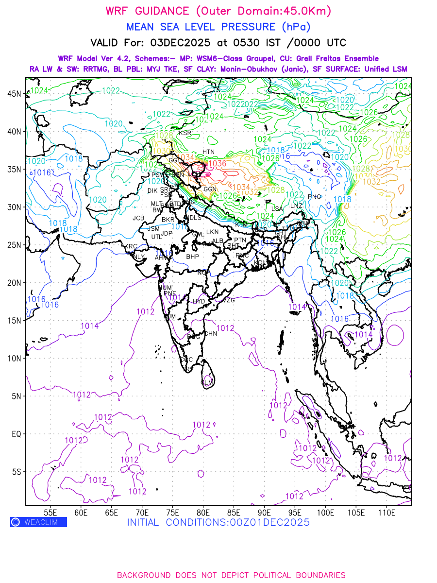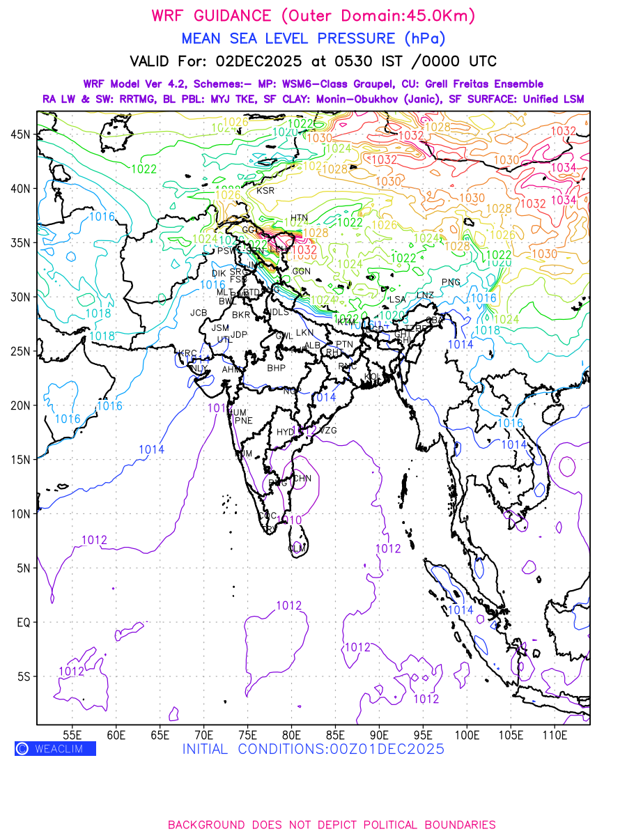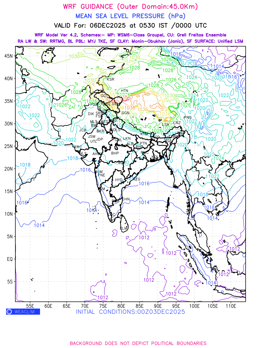 Mean Sea Level Pressure (MSLP) charts at the 24th hour generated using WRF Ver 4.2 at a resolution of 45 Km for India typically show a color-coded contour map of atmospheric pressure at sea level, with lines of equal pressure (isobars) indicating areas of high and low pressure over a geographic area. Meteorologists use these charts to identify areas of high and low pressure, which can give indications of storms, cold fronts, or warm fronts. The MSLP charts are also useful in identifying areas of convergence and divergence in the atmosphere, which can influence the formation or decay of weather systems.