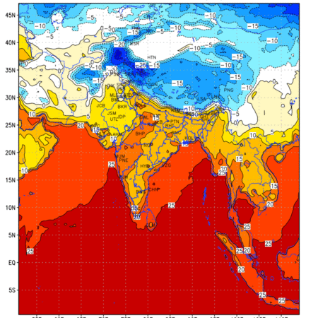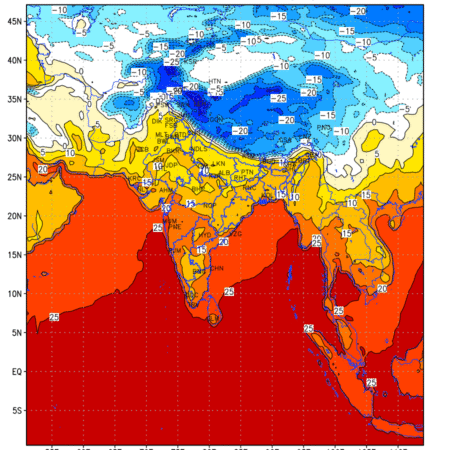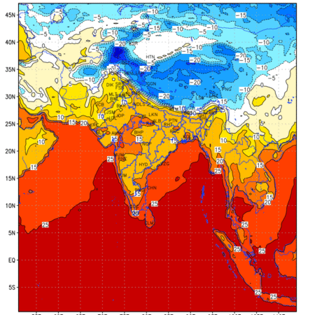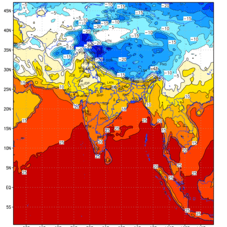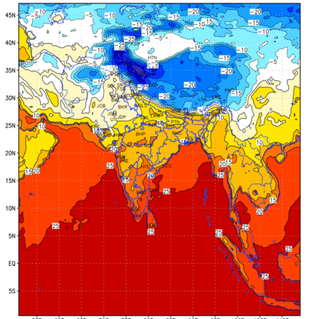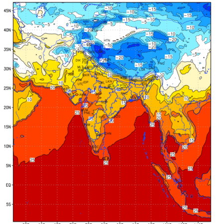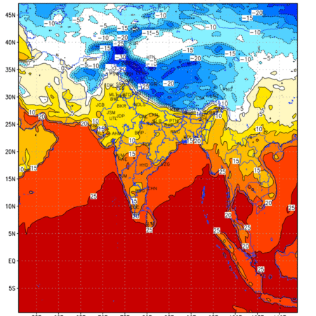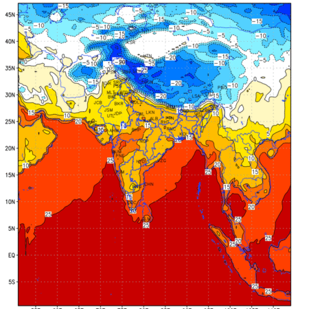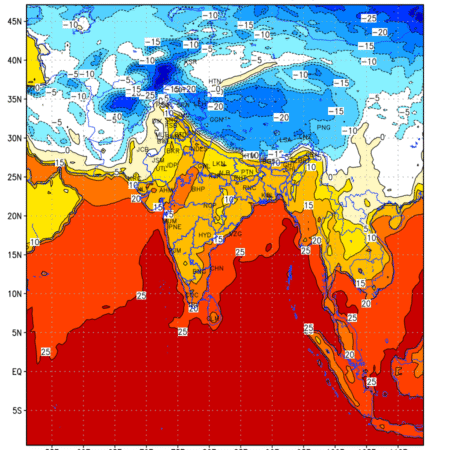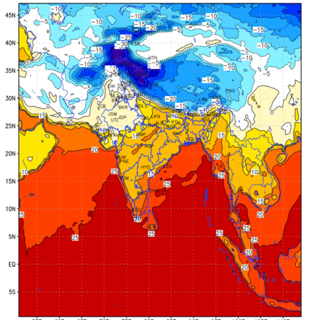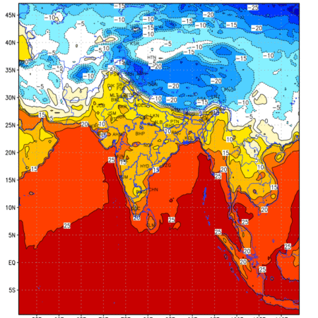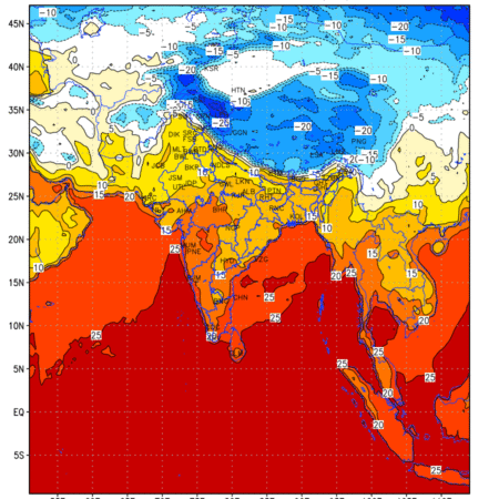 Minimum Temperature generated using WRF Ver 4.2 at a resolution of 45 Km for India depicts the highest temperatures at 2m above the ground surface between 0300 UTC of the previous date to 0300 UTC of the required date. This is an important variable for weather forecasting, as it determines the conditions at the Earth’s surface during the coldest part of the date, affecting human activities, agriculture, and the environment. 2m Temperature data can be used for a variety of applications, such as predicting the onset of cold spells, forecasting temperature trends, and studying the impact of weather on various systems and processes.