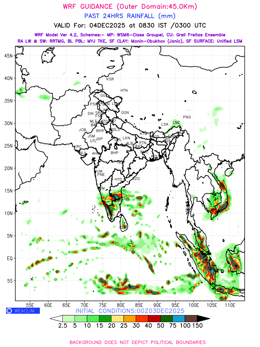 Rainfall forecast for 24 hours generated using WRF Ver 4.2 at a resolution of 45 Km for India is expected amount of precipitation in millimeters for a given area over a time period of 24 hours and valid from 0300 UTC (0830 IST) of the previous date to 0300 UTC of the required date. This prediction enables the users to plan/review their tasks that are affected by rainfall related severe weather events that may lead to flooding, drought, snowfall and avalanche etc.