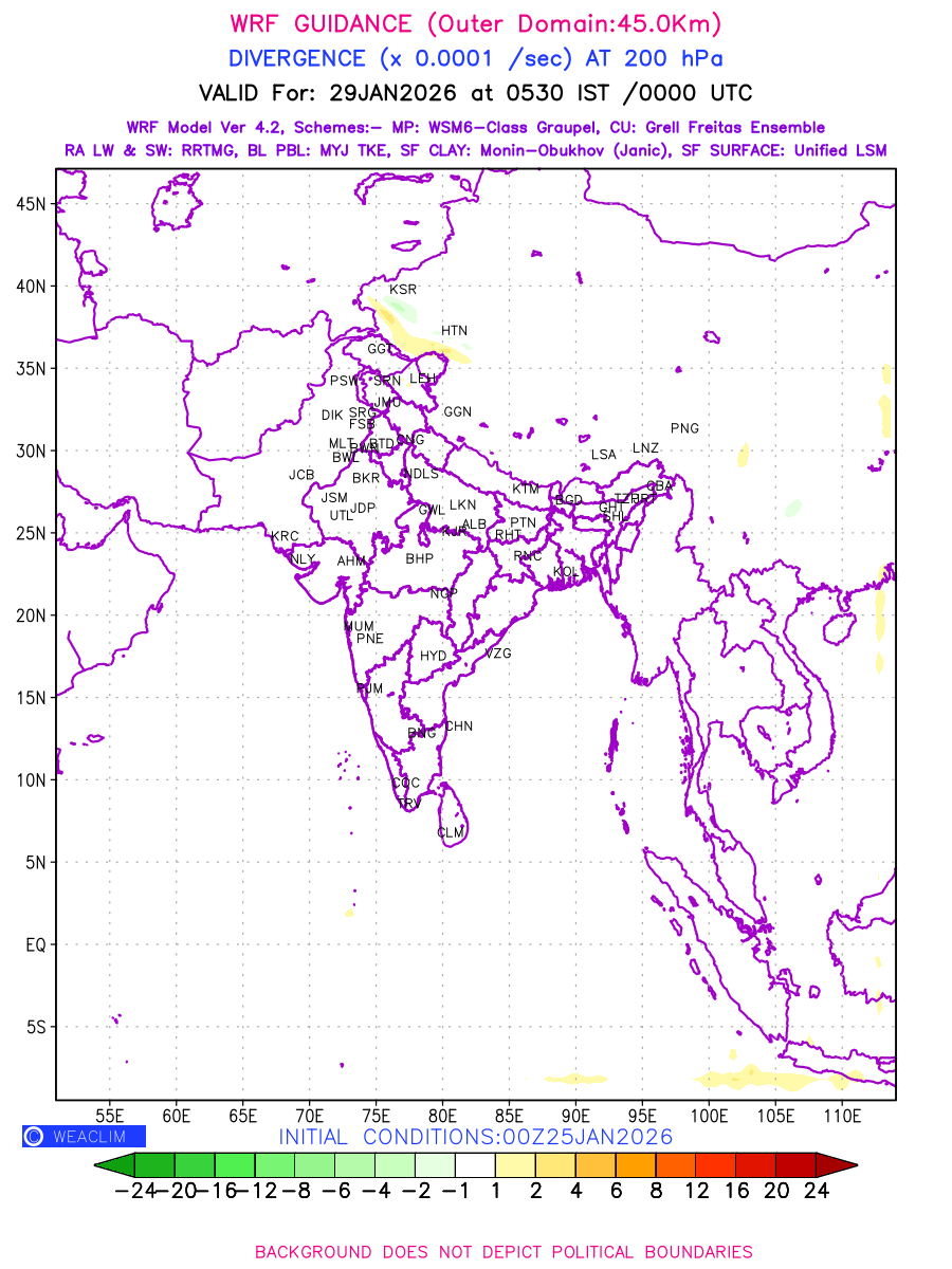 Upper Level Divergence at the 24 th hour generated using WRF Ver 4.2 at a resolution of 45 Km for India is the graphical representation that depict the magnitude and pattern of horizontal rotation (or the vorticity) of atmosphere around a vertical axis or the vorticity at 200 hPa (12.0km). It is displayed in warm colors such as red and yellow indicating positive vorticity (cyclonic rotation), and cool colors such as blue and green indicating negative vorticity (anticyclonic rotation). It can be associated with weather systems such as troughs, ridges, and jet streams.