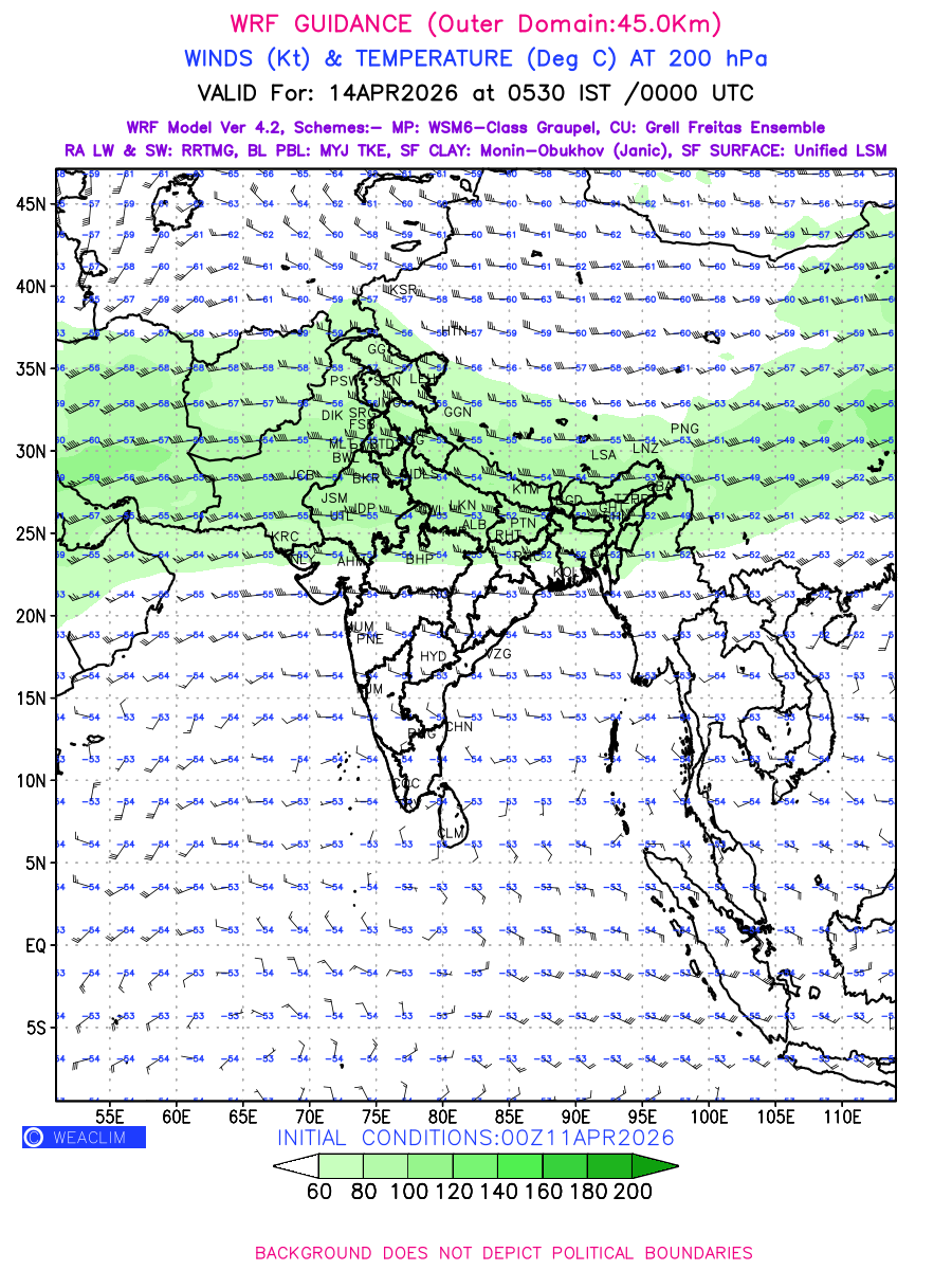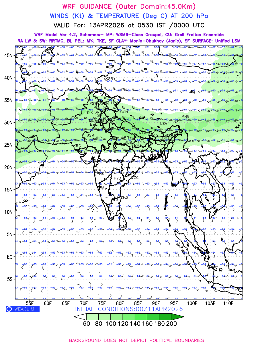 Winds at 200 hPa at the 24 th hour generated using WRF Ver 4.2 at a resolution of 45 Km for India refers to the predicted wind direction and speed at a pressure level of 200 hPa, which is located in the upper troposphere (approximately 12 kilometers or 7.5 miles above the Earth’s surface). The winds are presented knots (kt), and the direction is given in degrees from true north. ‘Jet Streams’ are marked in shades of green for winds with magnitude of more than 60 kt is a narrow band of high-speed winds that can influence weather patterns over large areas. Along with the wind speed (kt) and direction, upper air temperatures (Deg C) are also shown at the grid points over the Indian Region at 200 hPa level for the next four days.