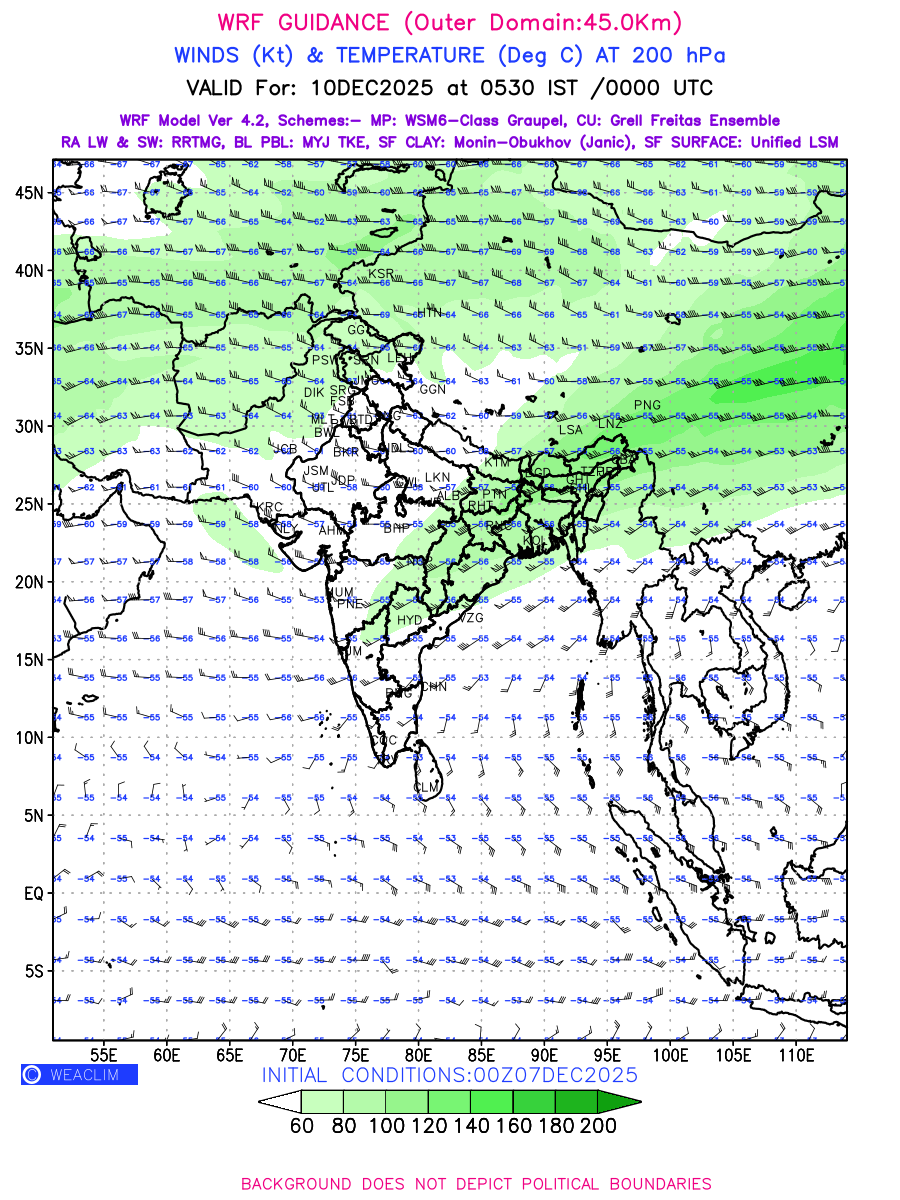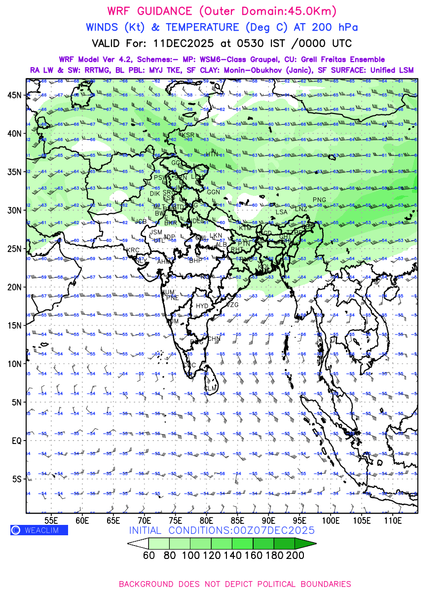 Winds at 200 hPa at the 24 th hour generated using WRF Ver 4.2 at a resolution of 45 Km for India refers to the predicted wind direction and speed at a pressure level of 200 hPa, which is located in the upper troposphere (approximately 12 kilometers or 7.5 miles above the Earth’s surface). The winds are presented knots (kt), and the direction is given in degrees from true north. ‘Jet Streams’ are marked in shades of green for winds with magnitude of more than 60 kt is a narrow band of high-speed winds that can influence weather patterns over large areas. Along with the wind speed (kt) and direction, upper air temperatures (Deg C) are also shown at the grid points over the Indian Region at 200 hPa level for the next four days.