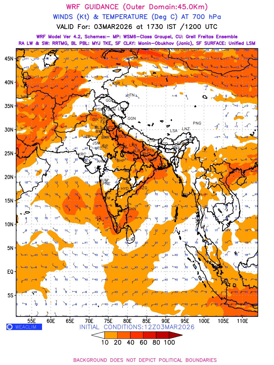 Winds at 700 hPa at the 24 th hour generated using WRF Ver 4.2 at a resolution of 45 Km for India refers to the predicted wind direction and speed at a pressure level of 700 hPa, which is located in the middle troposphere (approximately 3,000 meters or 10,000 feet above the Earth’s surface). The winds are presented in knots (kt), and the direction is given in degrees from true north. Winds with magnitude of more than 20 kt are marked in shades of red. At this level, the wind speed and direction can influence the movement and development of weather systems such as storms, fronts, and high-pressure systems.Along with the wind speed (kt) and direction, upper air temperatures (Deg C) are also shown at the grid points over the Indian Region at 700 hPa level for the next four days.